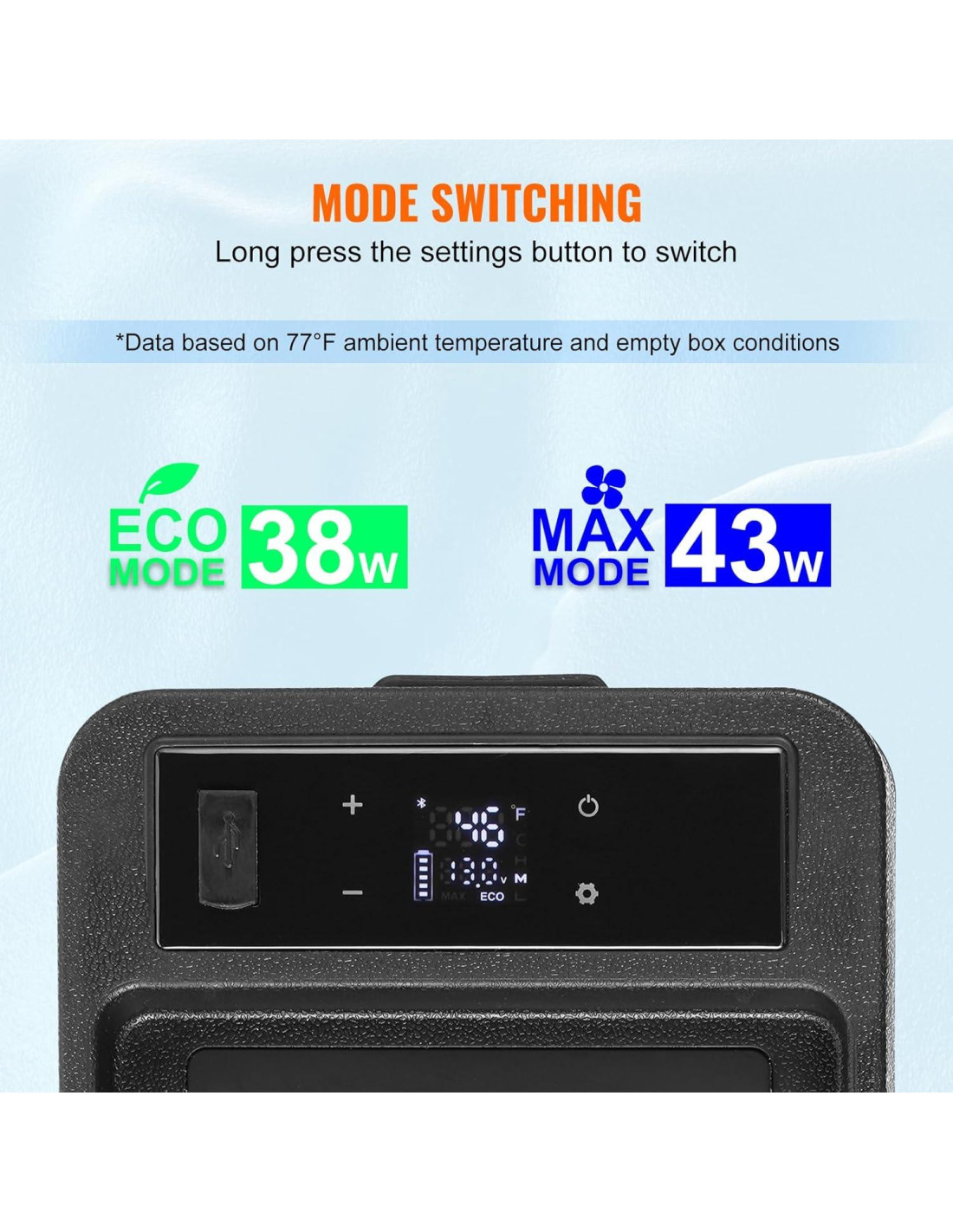 - Silencioso y Eficiente Energéticamente: El refrigerador opera con un ruido < 45dB, asegurando que duermas bien después de largos viajes. También puedes elegir entre los modos ECO y Max a través de la pantalla táctil LCD. En modo de ahorro de energía ECO, la potencia de funcionamiento de este refrigerador portátil es inferior a 38W. Incluso cuando funciona en modo MAX (43W), su circulación inteligente consume menos de 1 kWh/día.