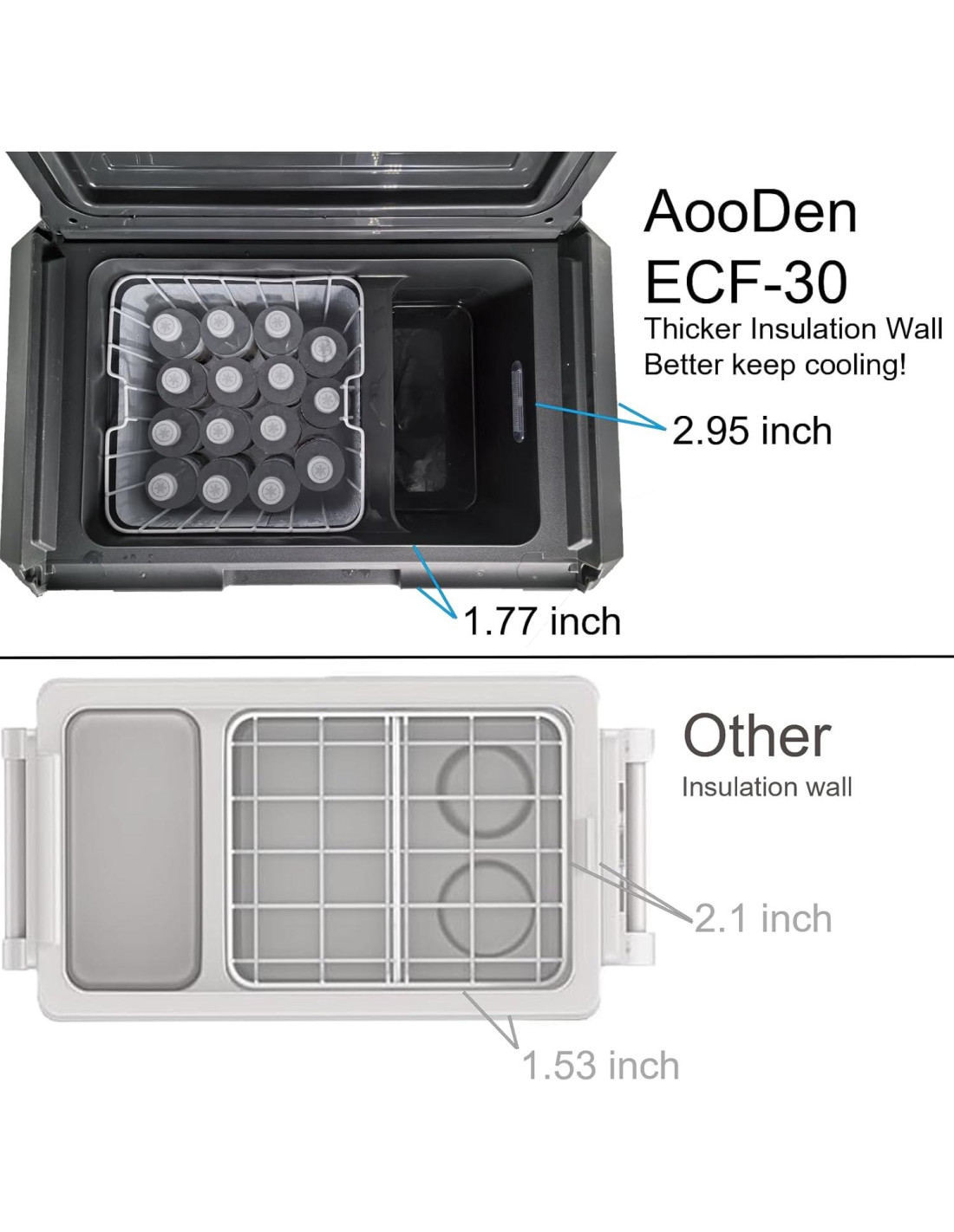 Este refrigerador de coche AooDen ECF-30 tiene una pared de aislamiento más gruesa que proporciona un mejor efecto de aislamiento que otras marcas. Está fabricado con calidad de alta resistencia, duradero y con un diseño humanizado. El compresor eficiente funciona para enfriar rápidamente bebidas, cerveza, vino, frutas durante los viajes. Rendimiento y eficiencia: un gran electrodoméstico para vehículos 4x4, casas rodantes, barcos y perfecto para tus viajes familiares por carretera, viajes de pesca en condiciones climáticas y ambientales particularmente difíciles.