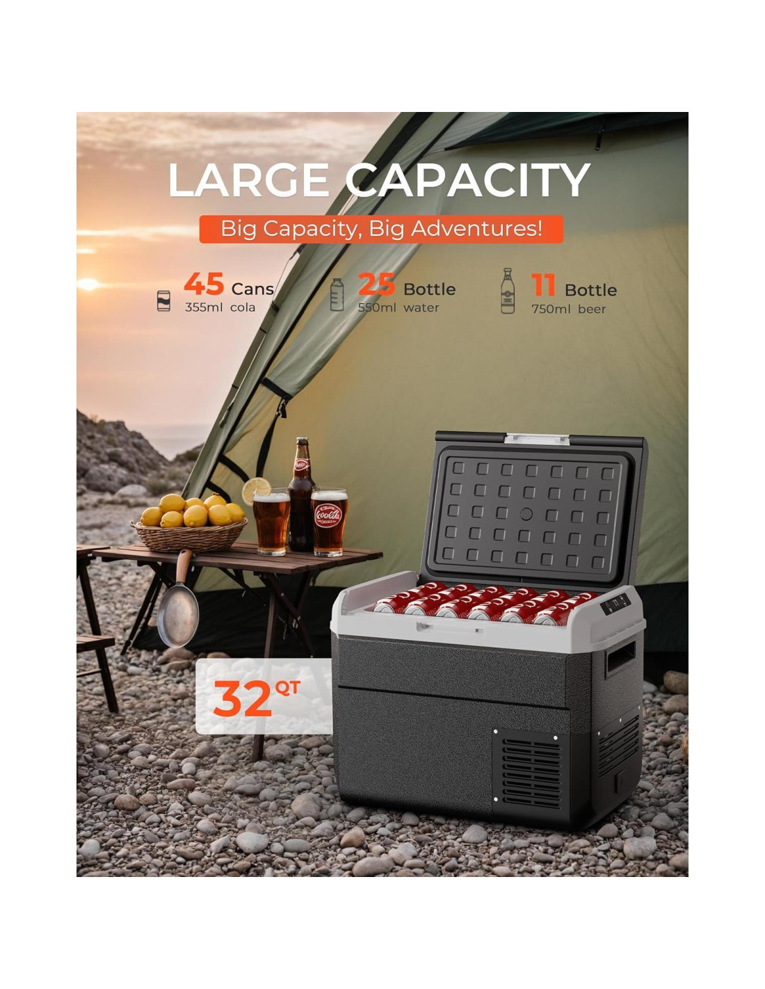 - Pantalla LCD y Bajo Ruido: El refrigerador de 12V cuenta con un panel de control LCD para ajustes de temperatura fáciles de -20F a 20F, junto con control por aplicación Bluetooth para mayor comodidad. Funcionando a un nivel de ruido de 45 decibelios, este refrigerador de coche de 12V está diseñado para ser resistente a golpes, asegurando que sus alimentos y bebidas se mantengan fríos sin perturbar su experiencia de viaje