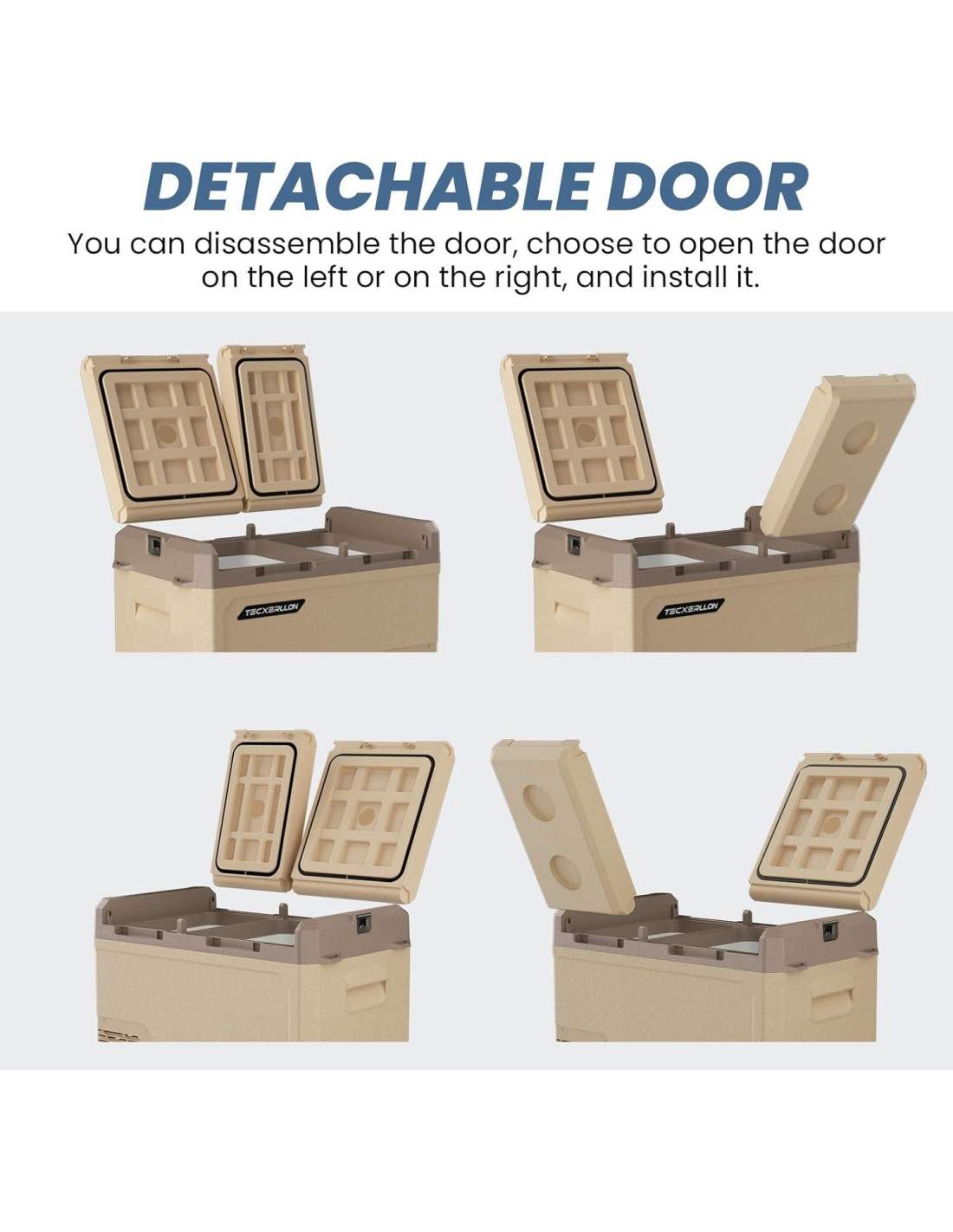- [Portátil y de Fácil Acceso con Puerta Desmontable] La puerta de este refrigerador de coche es desmontable y se puede reposicionar según tus necesidades, lo que facilita el acceso a tus alimentos y bebidas mientras conduces. Esta característica añade versatilidad, especialmente cuando necesitas acceso rápido en la carretera o en un camping.