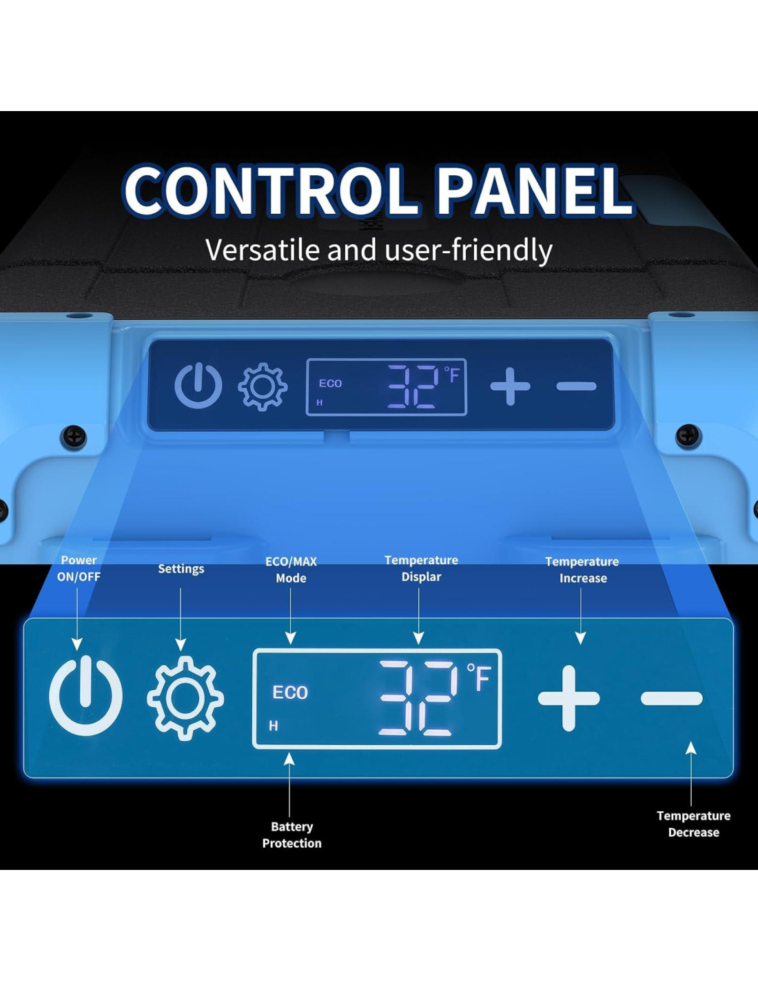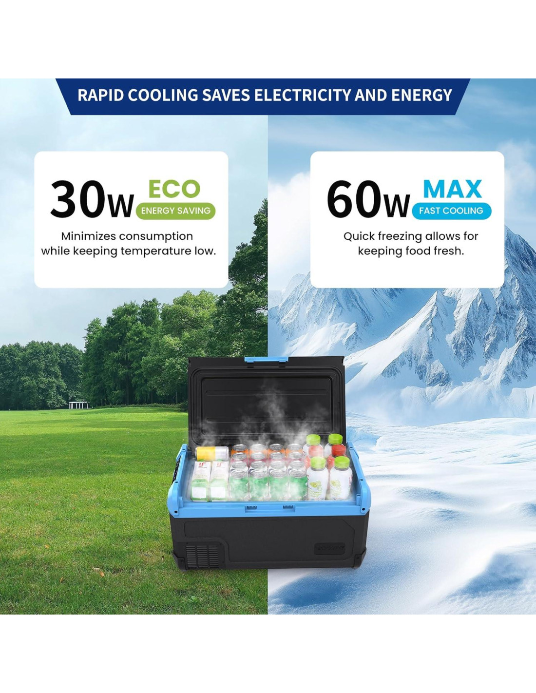 - Enfriamiento Ultra-Rápido con Evaporador Avanzado Equipado con un compresor de alto rendimiento y un evaporador de expansión por aire hecho de aluminio de grado aeroespacial. Ofrece una transferencia de calor más rápida y eficiencia de enfriamiento directo. Baja de 20C a 0C en 15 minutos, y a -20C en 50 minutos. Enfriamiento de 360 con aislamiento de espuma de 45mm y compuesto. No se requiere hielo, perfecto para refrigeración y congelación.