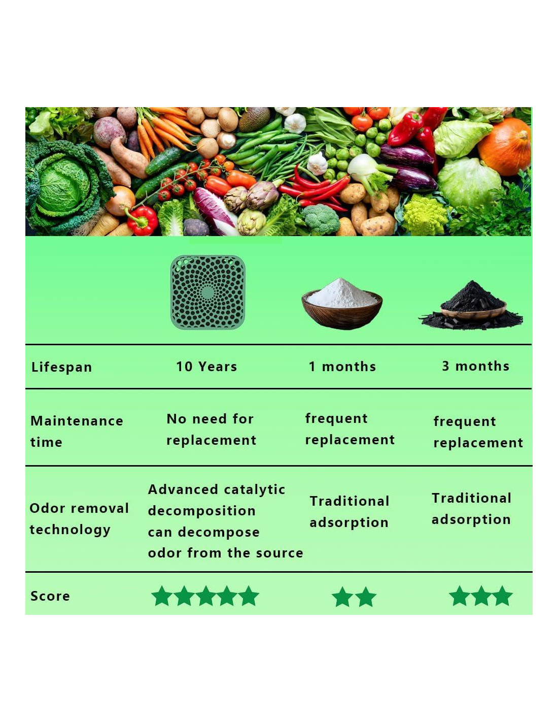 - Vida Útil de Hasta 10 Años: Comparado con los métodos tradicionales de usar bicarbonato de sodio y carbón activado para eliminar olores, el desodorante de refrigerador no necesita ser reemplazado con frecuencia. No requiere operación con batería. Simplemente colócalo en el refrigerador y comenzará a funcionar. El costo de uso es más bajo y el efecto de eliminación de olores está garantizado por al menos 10 años, lo que es mucho más largo que la vida útil de 12 meses.