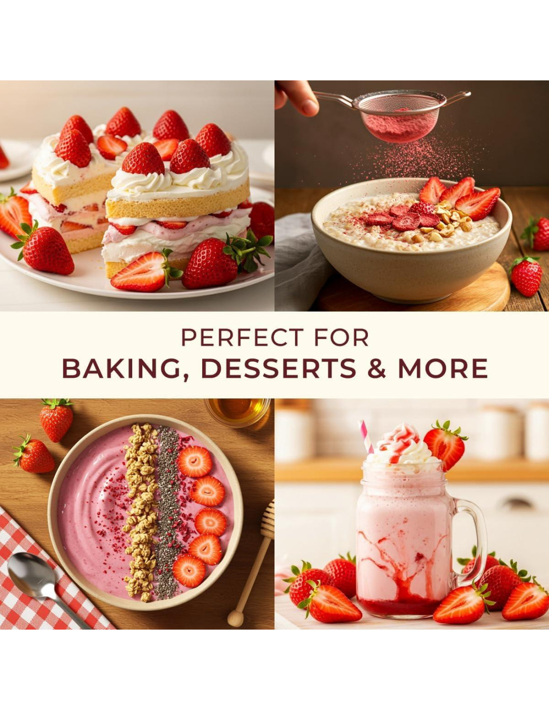 - Versatilidad para adaptarse a tu estilo de vida. Ya sea en la oficina o en casa, el polvo de fresa eleva las comidas sin esfuerzo. Espolvorea en bebidas, cereales y bocadillos para un giro sabroso que se integra perfectamente en la vida diaria.