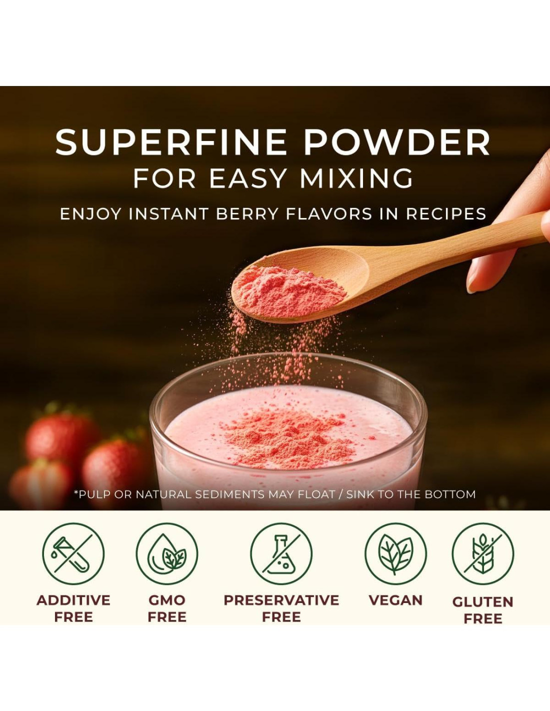- Profesionales y padres coinciden: la fresa para batidos es una opción confiable para una nutrición segura. Debido a los azúcares naturales, la pulpa o los sedimentos pueden hundirse o flotar a la superficie. Esto es normal para los polvos de frutas y está bien consumir.