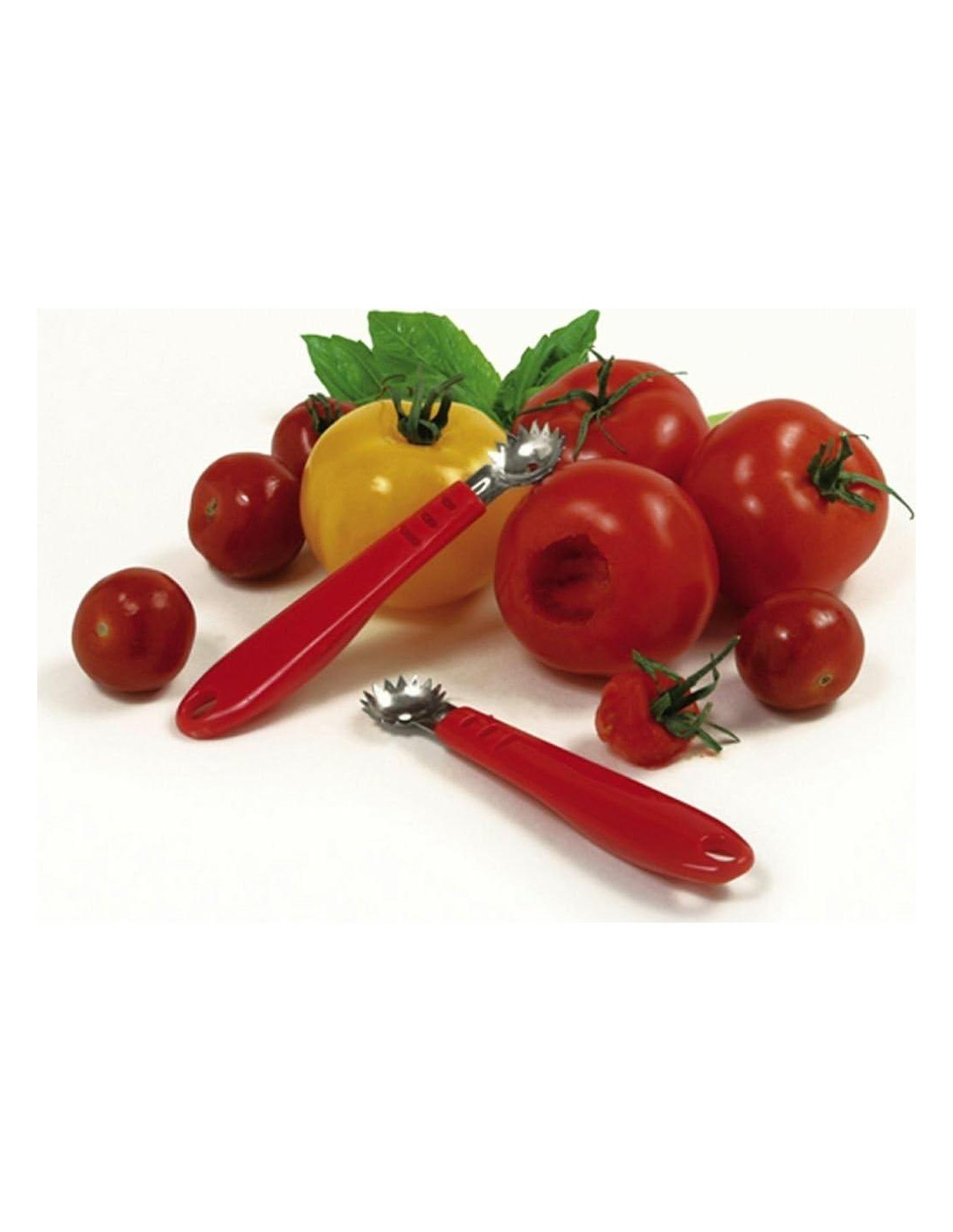 Core sus tomates y fresas sin esfuerzo con esta herramienta de corado de calidad. Hecha de plástico duradero y resistente, esta herramienta cuenta con dientes de acero inoxidable robustos que giran fácilmente los tallos y núcleos de sus frutas blandas. Incluye un mango suave y cómodo para un agarre fuerte y fácil. Nunca más tendrá que preocuparse por cortar o quitar el tallo de fresas o tomates. Mide 12 cm (4.75 pulgadas). Se recomienda lavar a mano. Para usar con tomates: Inserte los dientes del corador en el tallo y gire para sacar. Para usar con fresas: Enganche el tallo con los dientes del corador. Dientes de acero inoxidable y cuerpo de plástico duradero.
