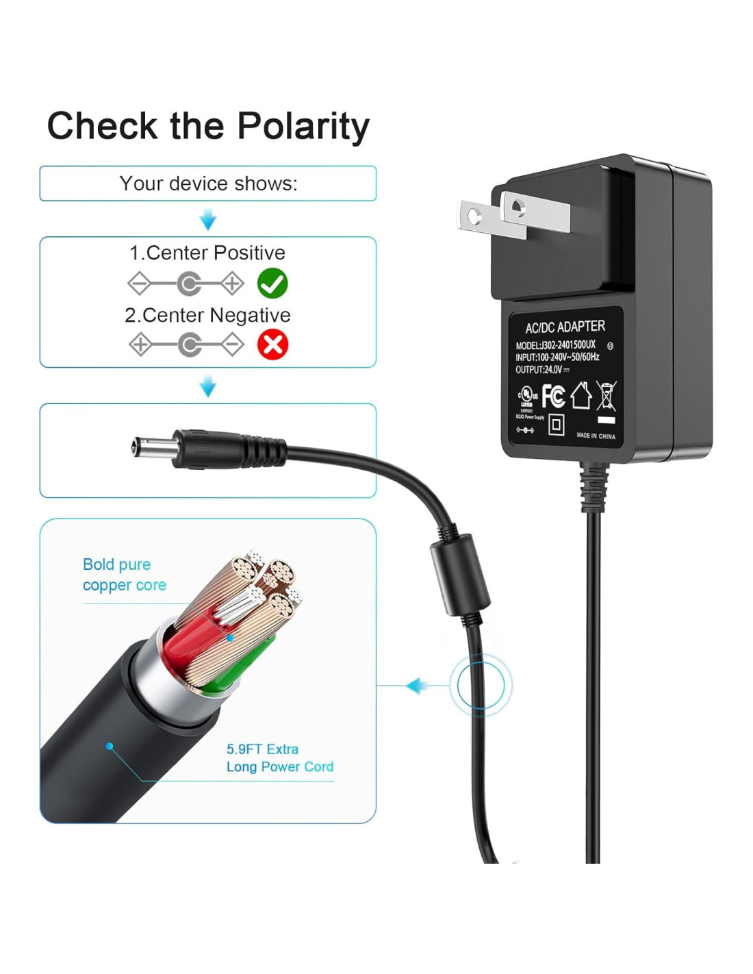 - [Descripción general del cable de alimentación del secador de esmalte de uñas de 24V:] adaptador de corriente de 24V voltaje de entrada mundial: AC 100V-240V 50-60Hz voltaje de salida: DC 24V, cable de alimentación de 24V / longitud del cable: 6 pies (1.8m), tamaño del conector DC: 5.5*2.5mm, que no es adecuado para otras especificaciones de la interfaz