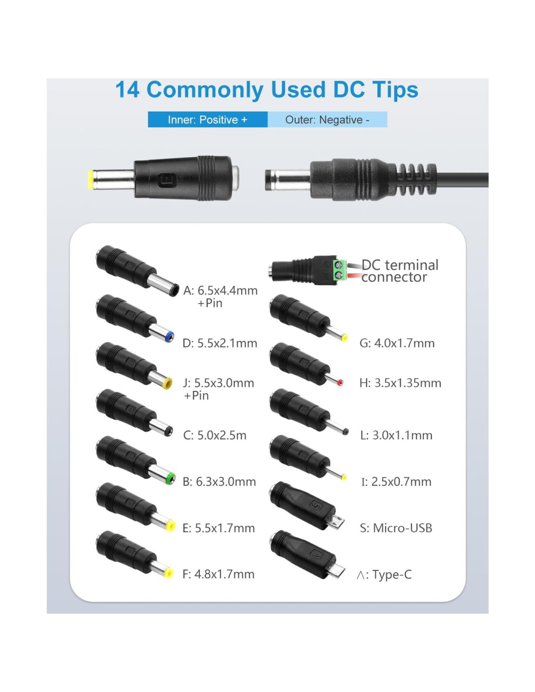 - Equipado con 14 Puntas DC Comunes: El cable de poder de 24V viene con una punta original de 5.5x2.5mm y 14 puntas de uso frecuente: 6.5x4.4mm+Pin, 5.5x2.1mm, 5.5x3.0mm+Pin, 5.0x2.5mm, 6.3x3.0mm, 5.5x1.7mm, 4.8x1.7mm, 4.0x1.7mm, 3.5x1.35mm, 3.0x1.1mm, 2.5x0.7mm, Micro-USB, Tipo-C y conector de terminal DC.
