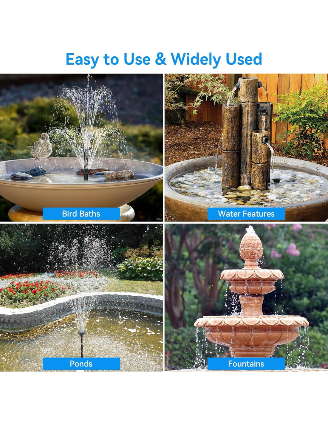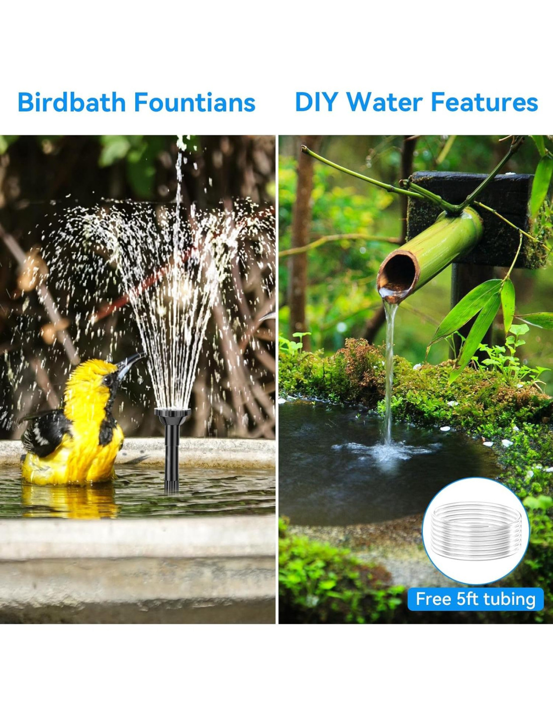 - [8 Modos de Rociado y 1.52m Tubo]: La fuente de baño de aves solar viene con varias boquillas para diferentes modos de rociado. También proporcionamos un tubo de 1.52m para crear una variedad de características de agua como cascadas, burbujeadores, corrientes u otra circulación de agua DIY.