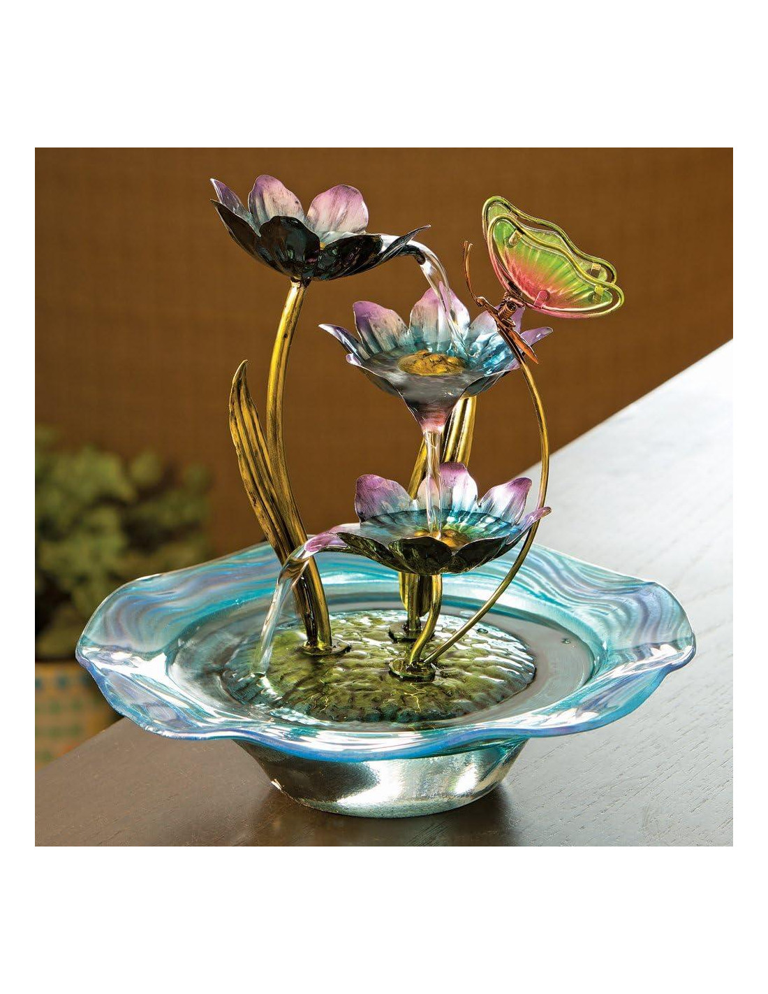 - Estatua de Mariposa: Construida con varios materiales diversos, incluyendo compuestos de resina escultórica, cuencos de vidrio y flores y hojas de metal, nuestra fuente de mesa iridiscente crea un acento relajante para cualquier hogar u oficina.