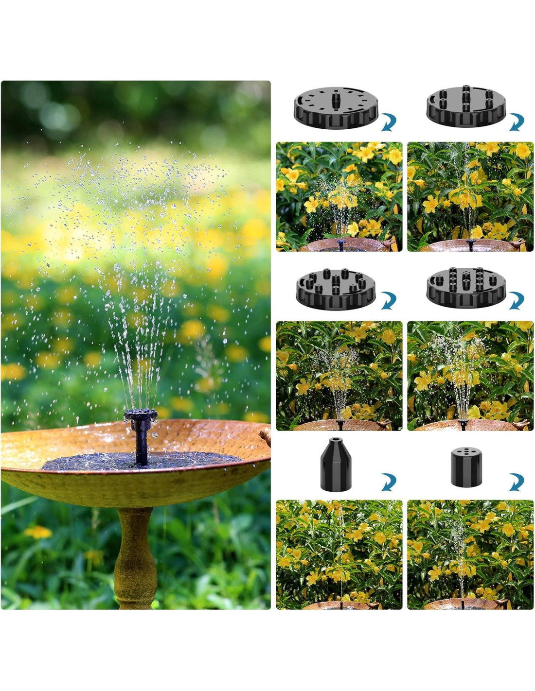 - [6 Modos de Rocío Ajustables]: La fuente de agua solar contiene 6 boquillas diferentes, que producirán diferentes formas de rocío y patrones de rocío. La altura se puede ajustar reemplazando las boquillas para evitar que el agua salpique fuera del recipiente. La altura del rocío puede alcanzar de 38 a 68 cm (15-27 pulgadas). Puedes reemplazar la boquilla fácilmente.
