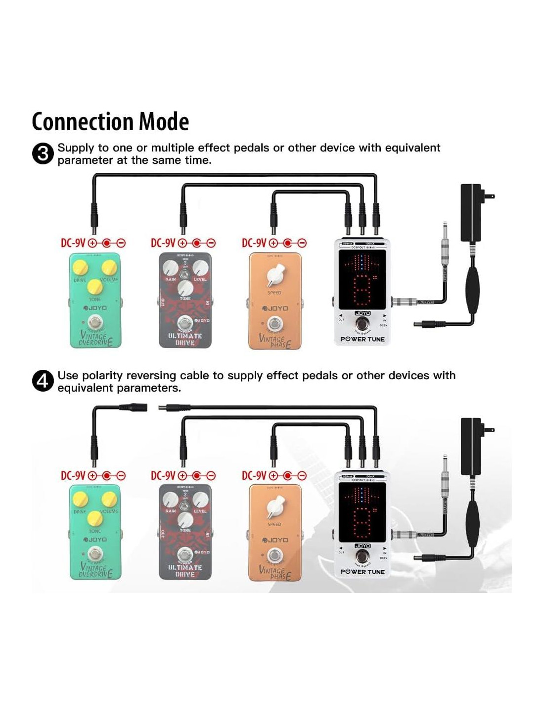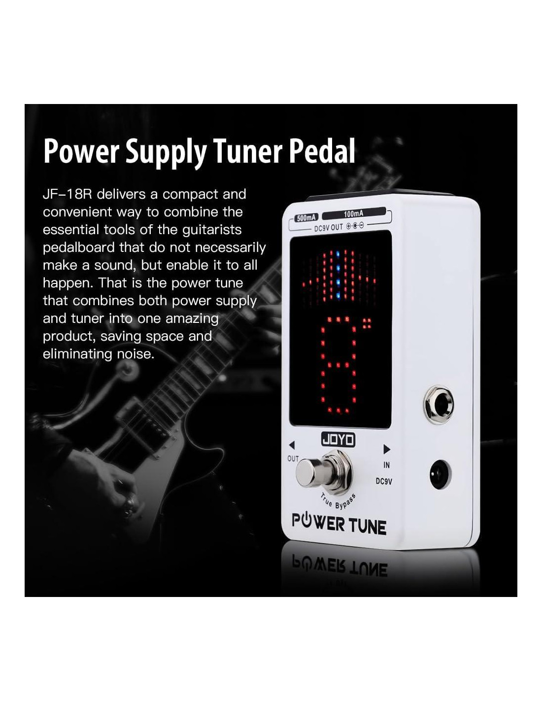 - JOYO Power Tune combina tanto la fuente de alimentación como el afinador de bajo en un increíble pedal, ahorrando espacio y eliminando ruido, 8 salidas DC 9V aisladas, cuenta con salida filtrada de bajo ruido con protección contra cortocircuitos y sobrecorriente.