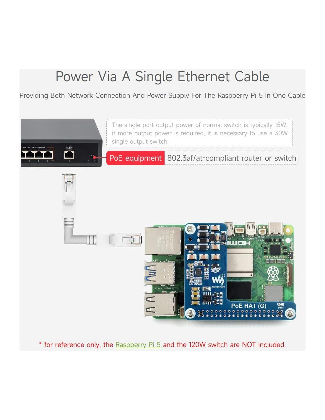 - Al usar con un enrutador o conmutador PoE que soporte el estándar de red IEEE 802.3af/at, es posible proporcionar tanto conexión de red como suministro de energía para su Raspberry Pi en solo un cable Ethernet.
