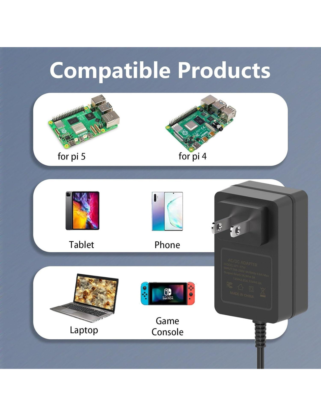 - Compatibilidad: Compatible con Raspberry Pi 5 4GB/8GB, fuente de alimentación USB C de 27W diseñada para Raspberry Pi 5.