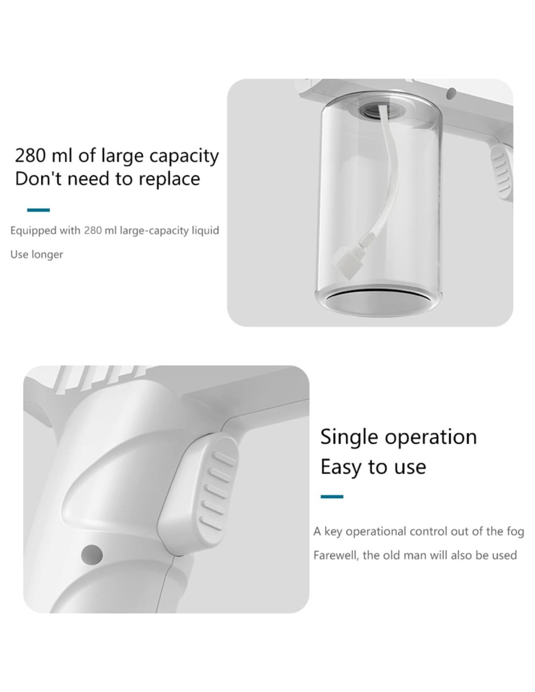 - Recargable y recargable: Equipado con batería recargable de 1200mAh y botella de líquido de 280ml, esta pistola de spray nano es muy portátil y se puede reponer el líquido en la botella en cualquier momento.