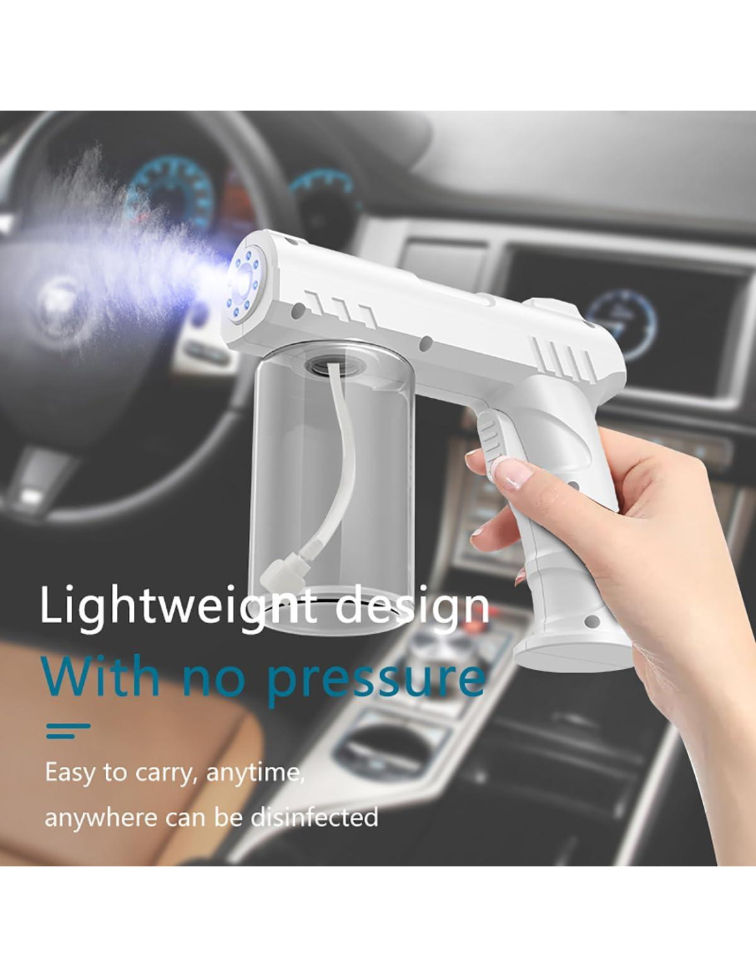 - Ligero y potente: este spray atomizador pesa aproximadamente 270 gramos (0.6 libras), pero puede producir un spray ultra-fino continuo. Le permite limpiar fácilmente su entorno mientras rocía uniformemente sobre un área grande. El atomizador de luz azul nano puede iniciarse con un clic, niebla rápida