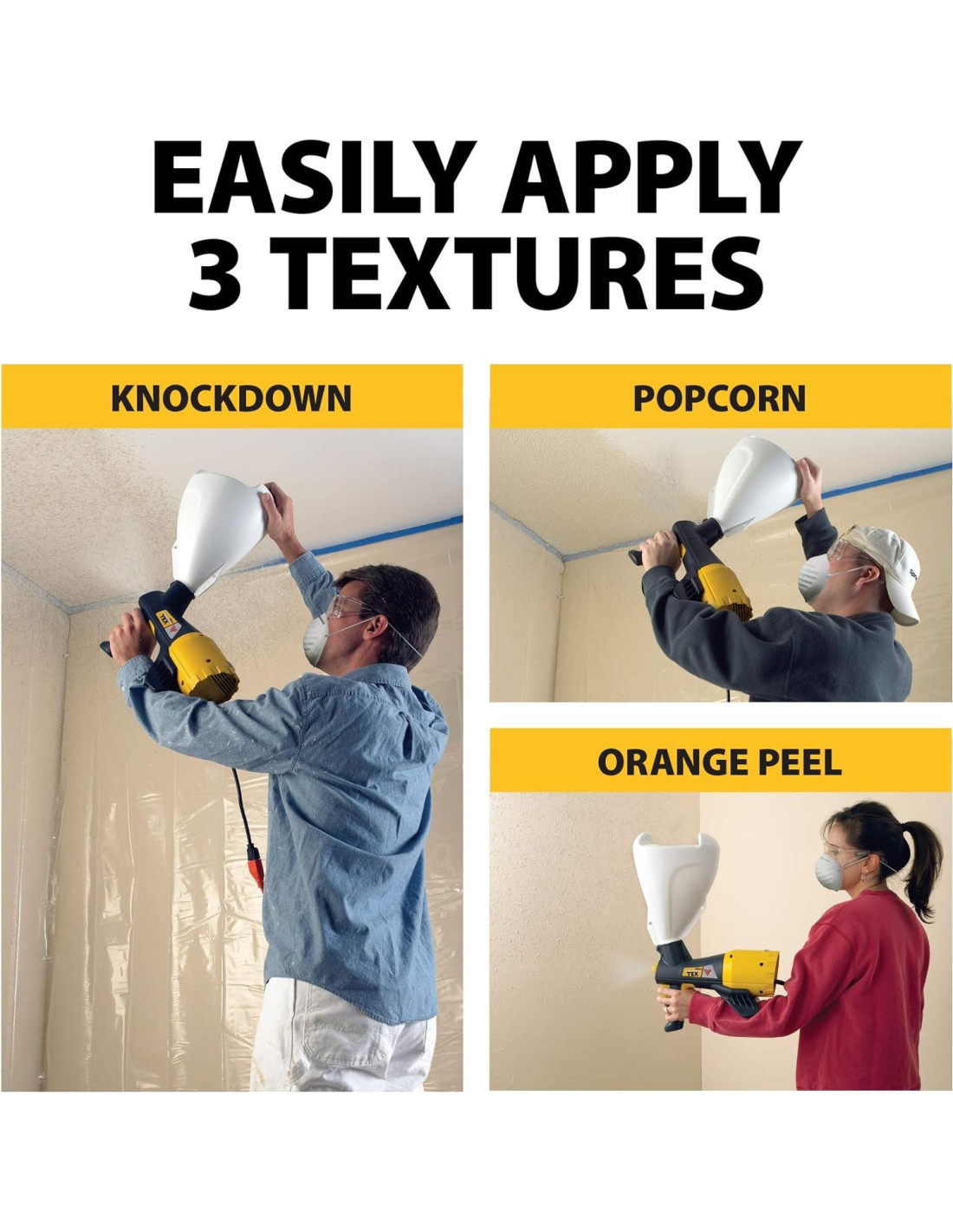 - TRES BOQUILLAS INCLUIDAS: Use las boquillas intercambiables incluidas para crear expertamente texturas acústicas de palomitas, knockdown y cáscara de naranja