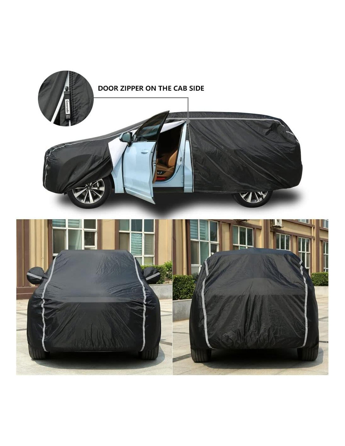 - Diseño Profesional: 1. Funda de coche SUV con puerta con cremallera a la izquierda para fácil acceso. 2. La funda de coche exterior tiene correas a prueba de viento en la parte delantera, media y trasera para fijar tu funda en condiciones de viento fuerte. 3. Las fundas exteriores completas tienen grandes franjas reflectantes largas para recordar a las personas por la noche. 4. Funda de coche impermeable con bonito bolsillo para espejo y dobladillo elástico alto que hace que la funda sea más adecuada