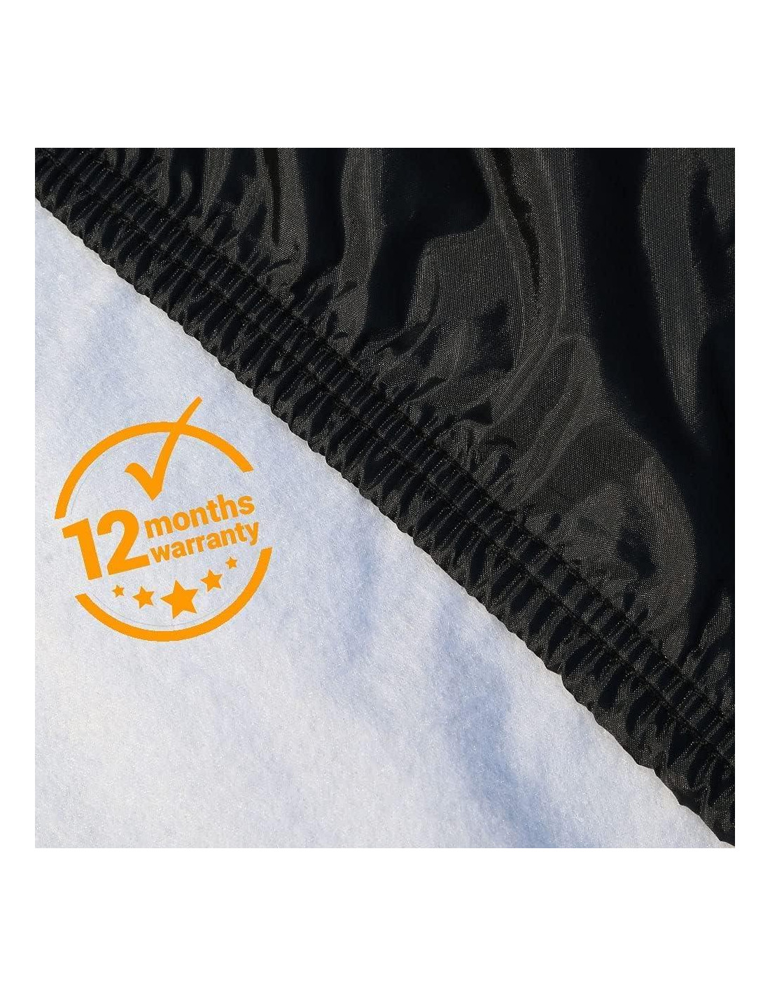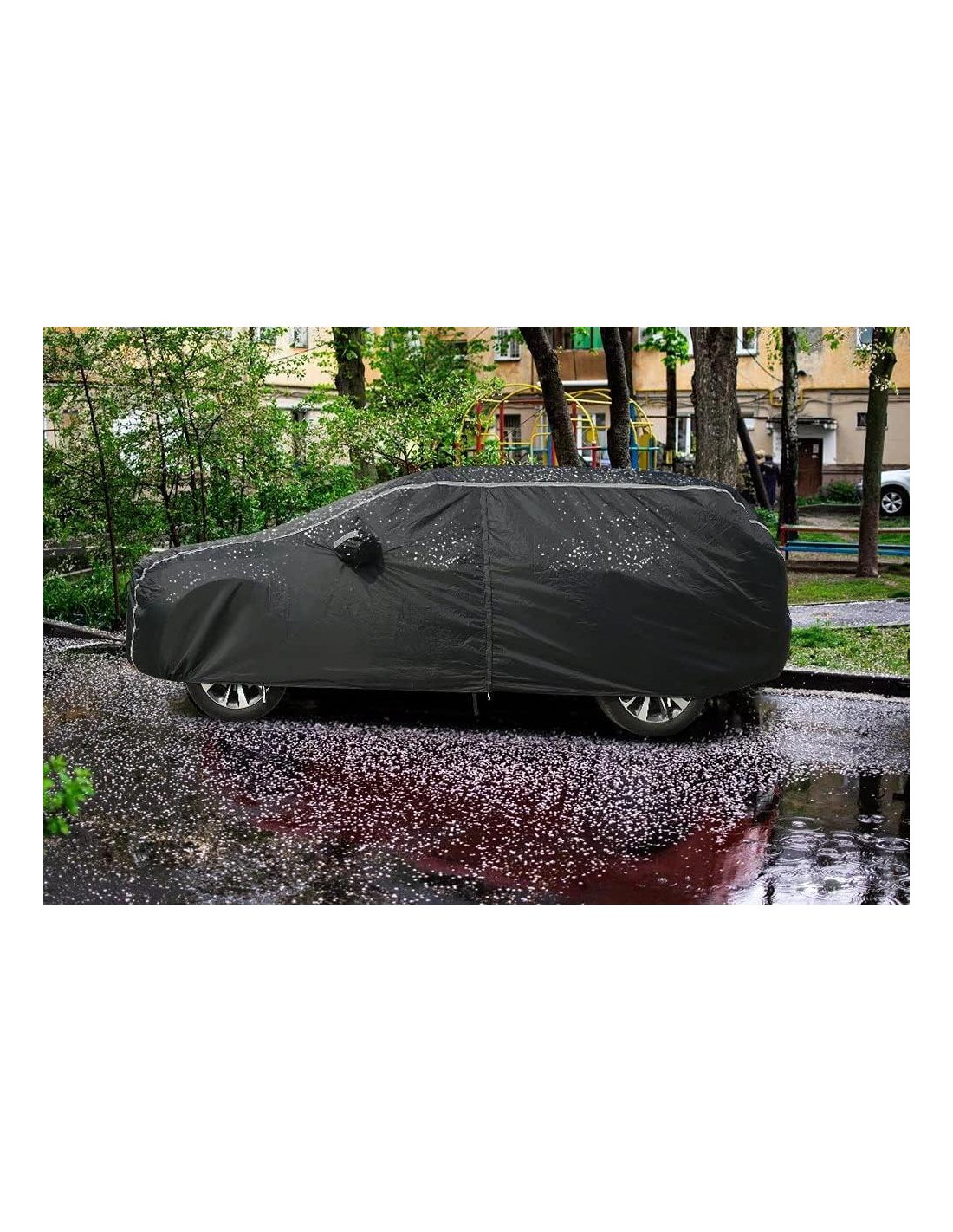 - Material Perfecto: La funda de coche impermeable para todo clima está hecha de material 190T. 1. La capa exterior de la funda de coche negra es de poliéster altamente reflectante, que es bueno para la protección solar, bloquea efectivamente los rayos UV y previene el envejecimiento del interior. Mantiene tu coche fresco incluso en los días calurosos de verano. 2. La capa interior de la funda de coche es de algodón suave para proteger la pintura. 3. Recubrimiento impermeable de PU en la superficie, duradero y resistente a desgarros, a prueba de lluvia y nieve