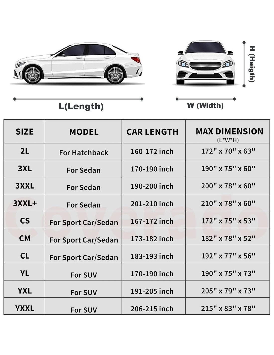 - Recordatorio Amistoso: 1. La funda de coche Coverado proporciona una tabla de tamaños (imagen 6-7), pero no todos los años se ajustarán. Por favor, verifica los detalles del coche antes de pedir la funda - Hatchback Sedan Coche Deportivo o SUV; Fecha de fabricación; Longitud total del coche. 2. El paquete incluye: 1 * funda de coche SUV, 1 * bolsa de almacenamiento, 1 * kit de parche para antena. 3. Si tienes alguna pregunta sobre nuestro producto, te ayudaremos a resolver el problema, gracias
