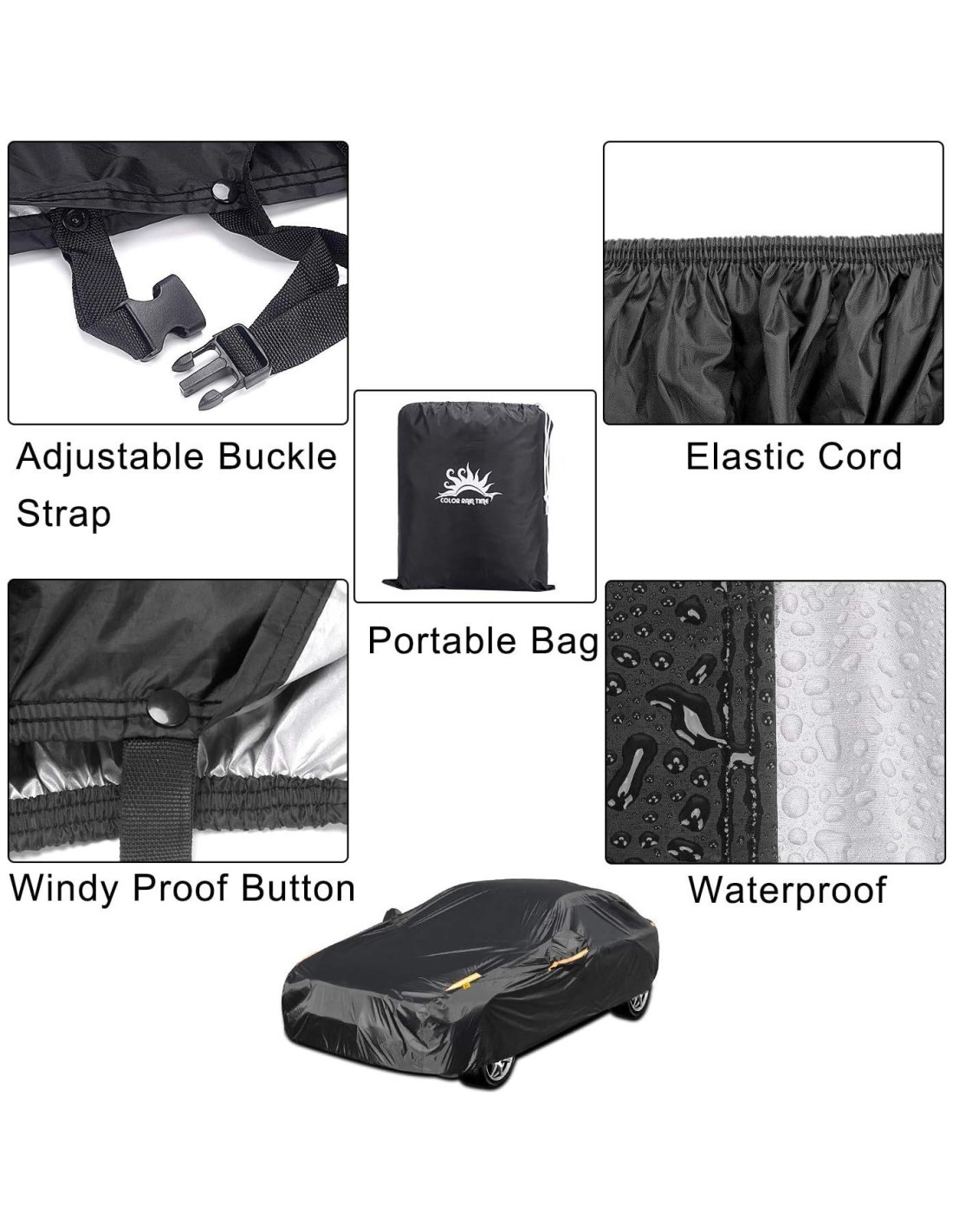 - [Diseño resistente al viento] Esta cubierta de coche impermeable para todo clima está especialmente diseñada para resistir vientos fuertes. Tres correas a prueba de viento diseñadas especialmente en la parte inferior pasan por el medio del vehículo para asegurar que la cubierta se mantenga en su lugar. Una correa adicional a prueba de viento en la parte trasera del coche evita que la cubierta trasera sea levantada por el viento.