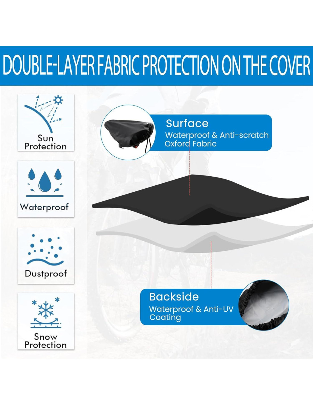 - DURABILIDAD: La superficie está hecha de material de doble capa resistente al desgaste y a desgarros, sin importar el entorno, tu asiento asegura que esté protegido de cualquier clima, polvo y lluvia, manteniéndolo limpio y funcional. Un accesorio imprescindible para ciclistas.