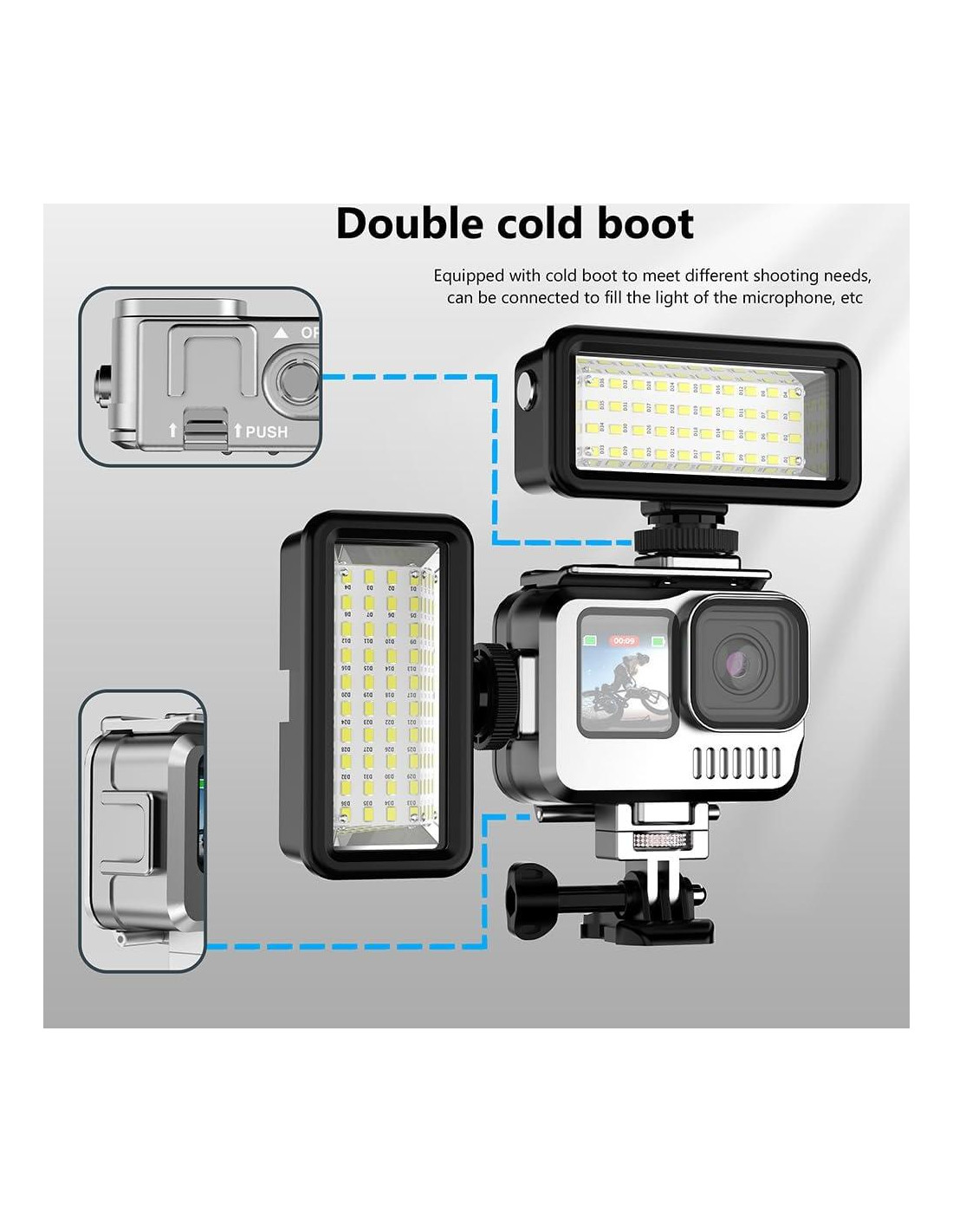 - Diseño de Zapata Fría Doble: la funda impermeable de aluminio con 2 zapatas frías, puede conectarse a luces de relleno, micrófonos y otros equipos fotográficos.