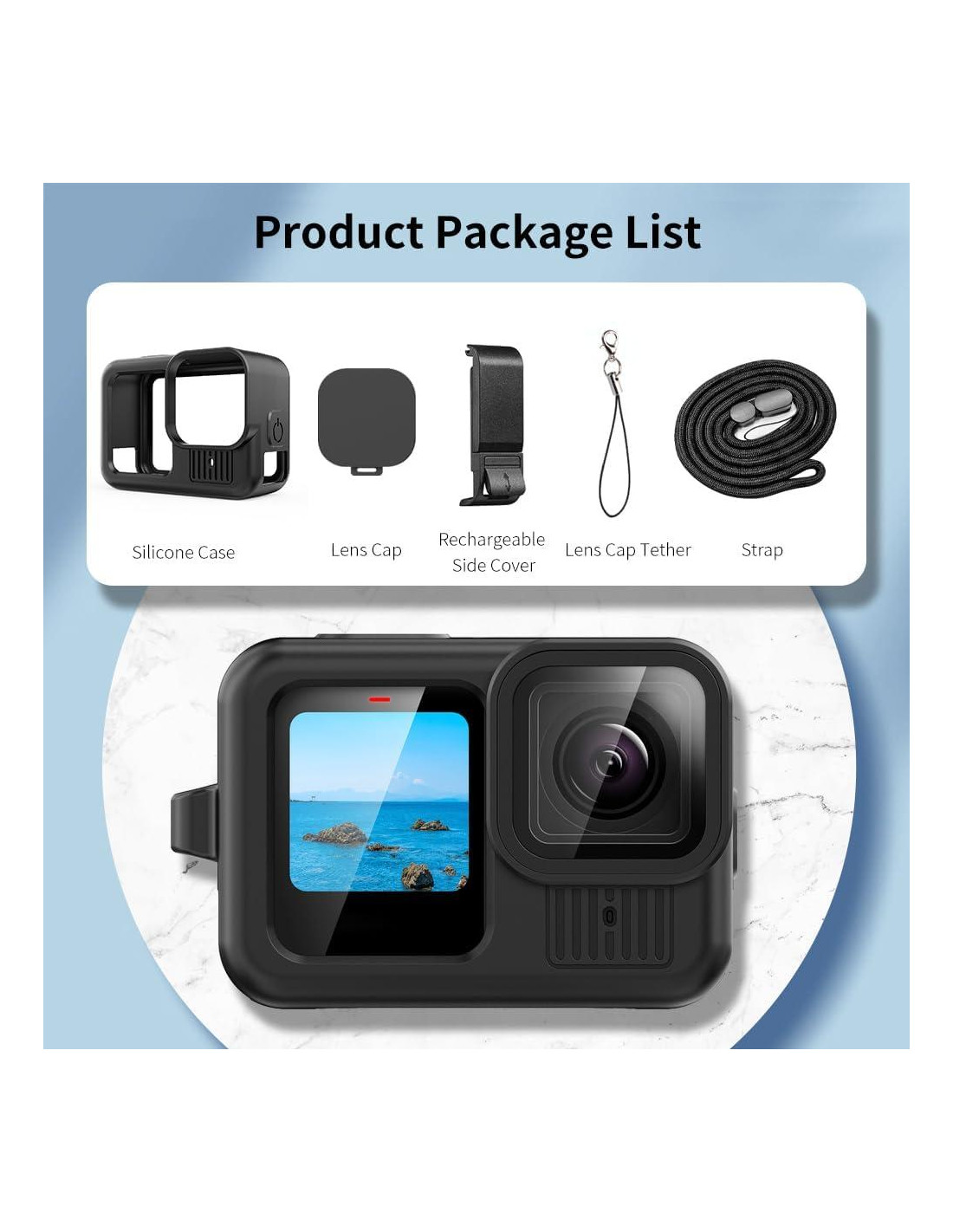 - Lo que recibirás: Carcasa de silicona Hero 13 x1; Tapa de lente de silicona Hero 13 x1; Puerta lateral de batería x1; Cordón x1; Cuerda de 4M x1