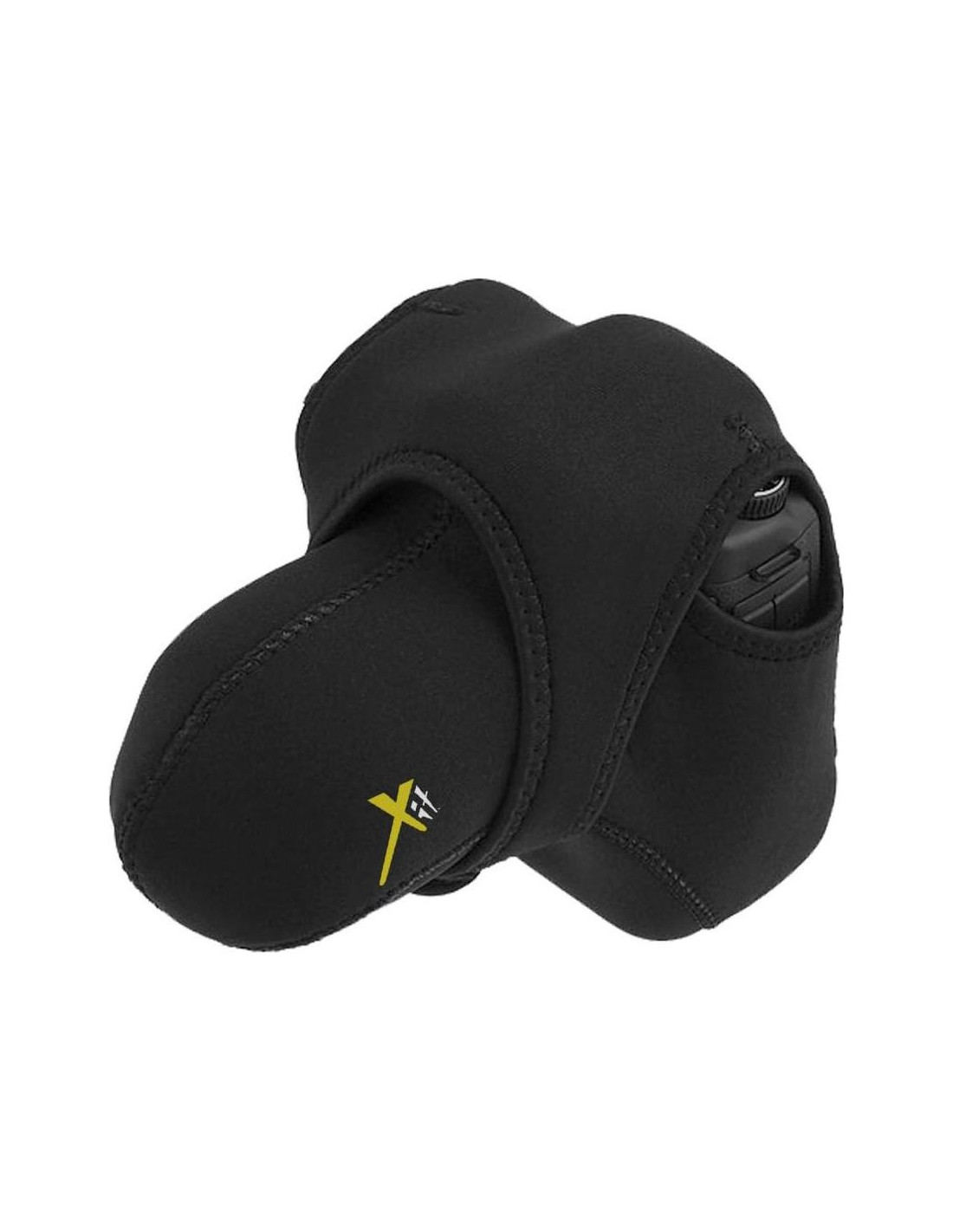 La envoltura reversible de neopreno elástico Xit XTSTL Grande es negra por un lado y gris por el otro. Cubre todo el cuerpo de la cámara DSLR con un lente de tamaño mediano. Cuenta con un cierre de Velcro.