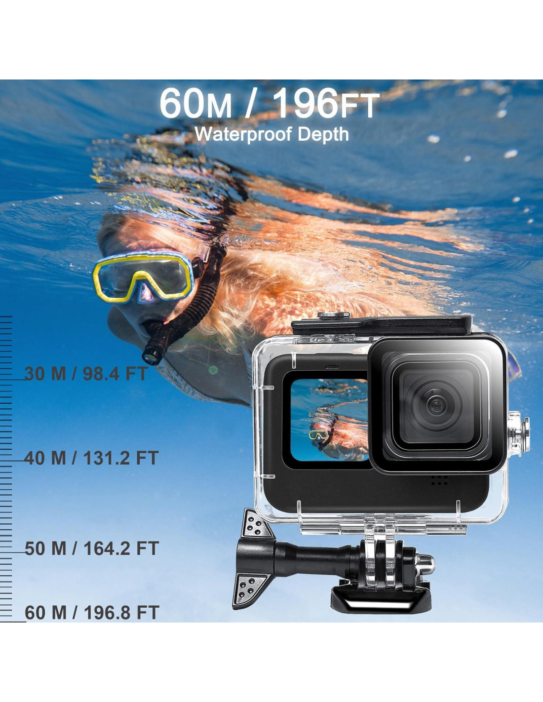 - Impermeable hasta 60M/196FT (18.3m) incluso moviéndose bajo el agua a profundidades de 60 metros/196 pies (18.3m) sin preocuparse por fugas. La carcasa impermeable adopta un anillo de sellado impermeable mejorado y un cierre ajustado, evitando efectivamente la filtración de agua o el empañamiento. El inserto antiempañante complementario también puede absorber efectivamente la niebla de agua.