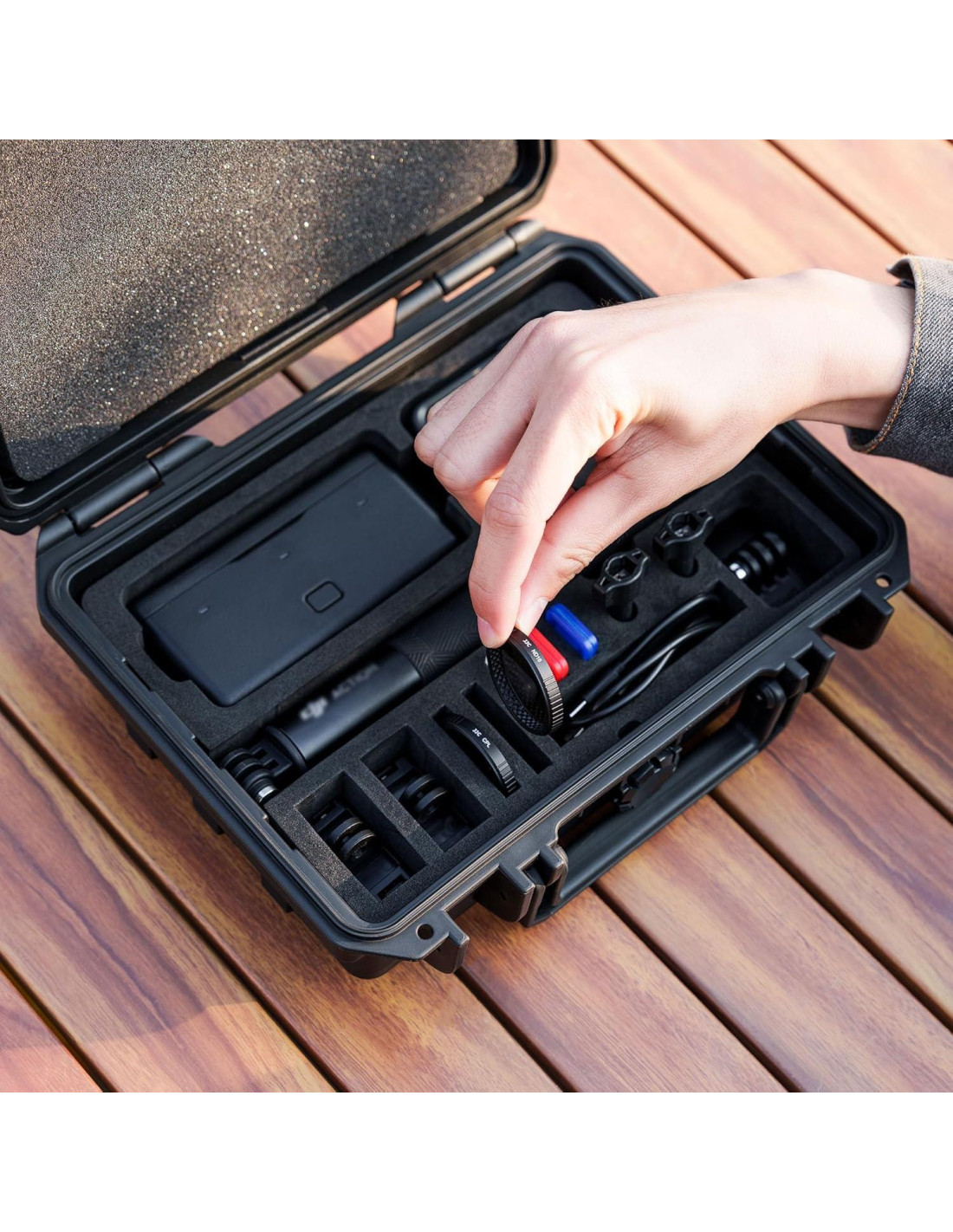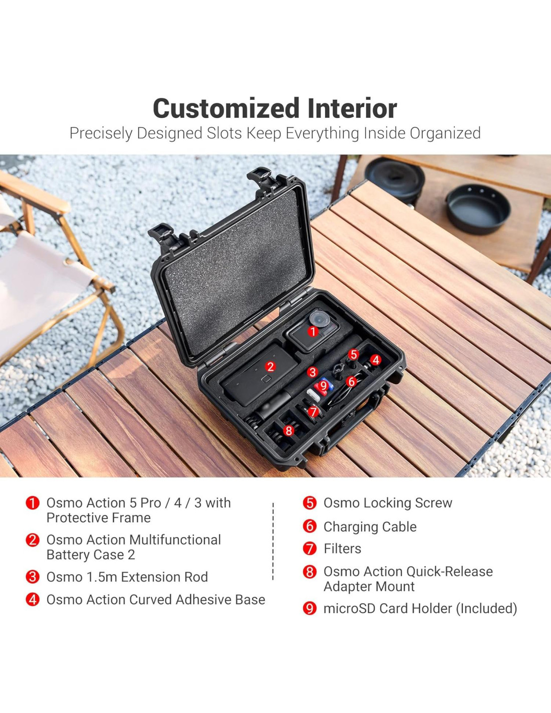 - [Gran Capacidad] Almacenamiento ligero y portátil para 1x Osmo Action 5 Pro / 4 / 3 y Funda Protectora, 1x estuche para batería de Osmo Action, 1x mango de batería de Osmo Action, varilla de extensión de 1.5m, 1x base adhesiva curva de Osmo Action, tornillo de bloqueo, filtros ND, filtros, adaptador de liberación rápida, cable Tipo-C, 3x Soporte para Tarjeta MicroSD (incluido). Garantía de 12 meses.