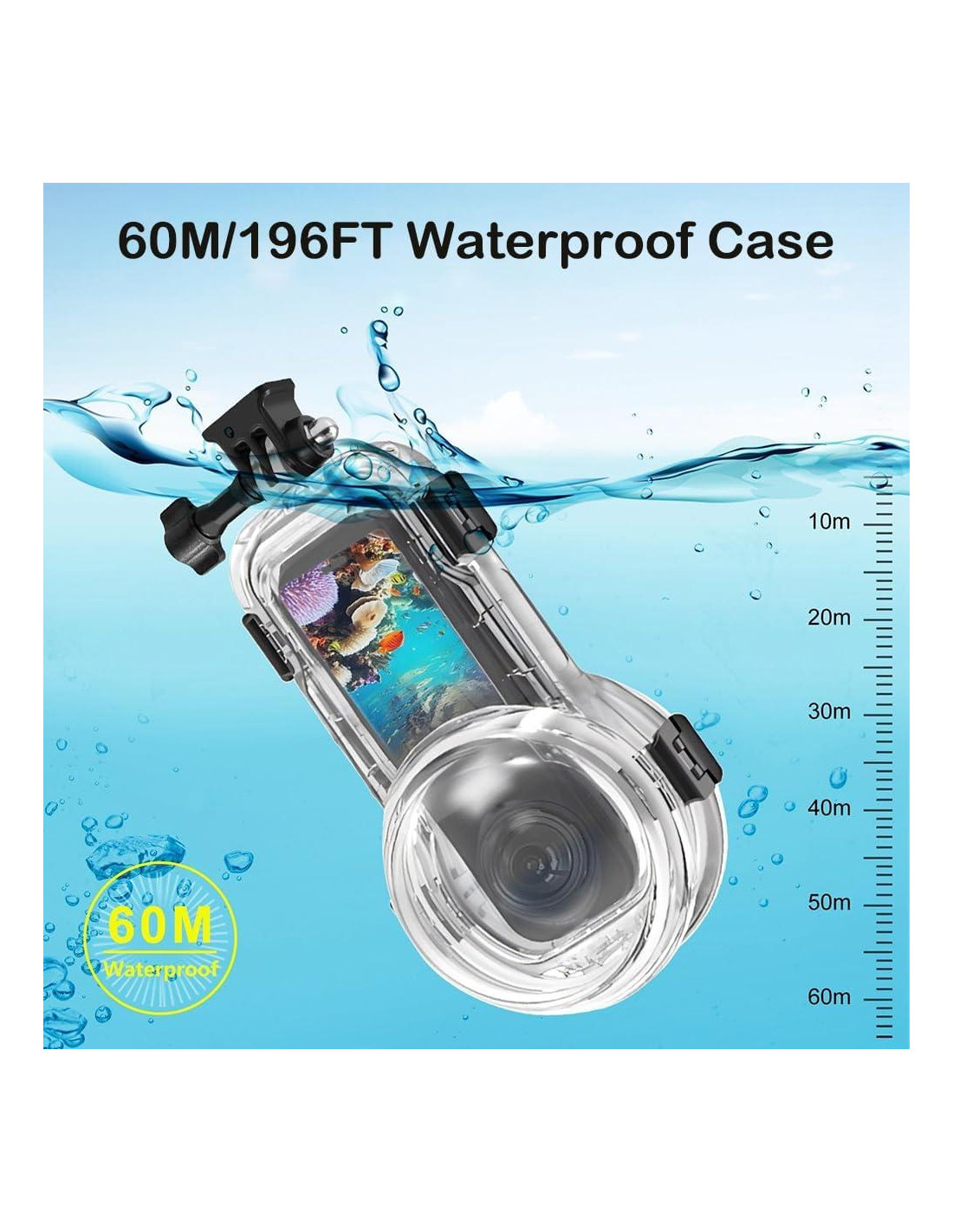 - 60M/196FT Impermeable: la carcasa impermeable invisible para Insta 360 X5 con lente de vidrio templado para proteger la lente de su cámara, lente HD con alta transmisión de luz, incluso bajo el agua 60M/196FT no dañará el efecto de grabación, claro y realista.