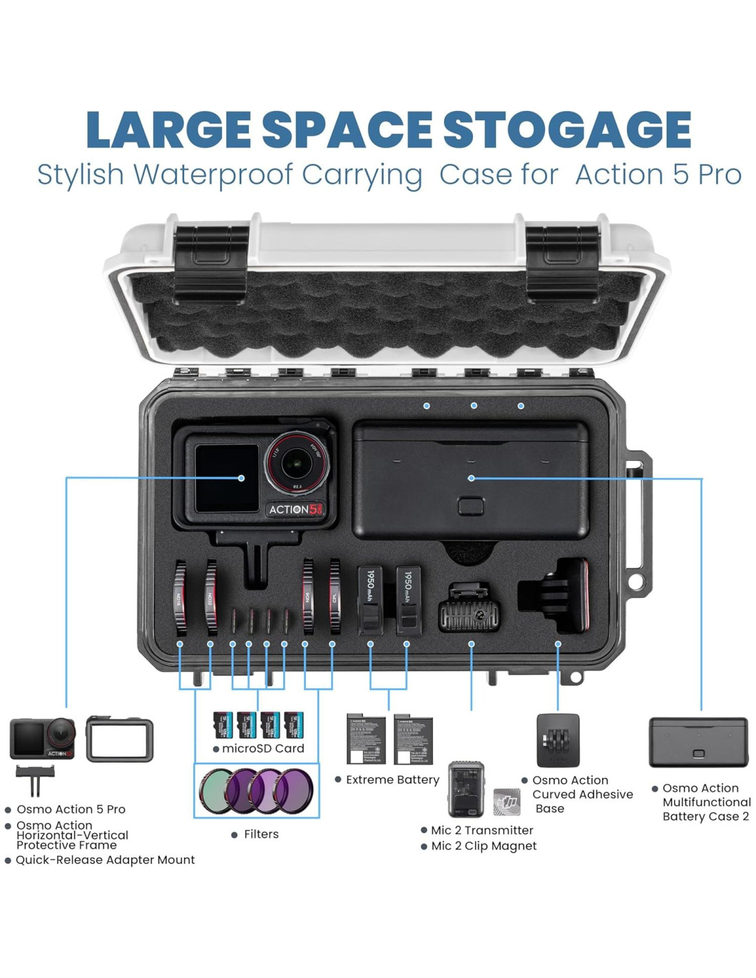 - Capacidad de Almacenamiento: Estuche portátil para organizar la cámara Osmo Action 5 Pro con un diseño mini que puede almacenar una cámara Action 5 Pro con jaula protectora, hub de carga, baterías adicionales, micrófono, adaptador de liberación rápida, filtros ND, tarjetas SD y muchos otros accesorios de cámara que satisfacen las necesidades de viajes de ocio diarios.