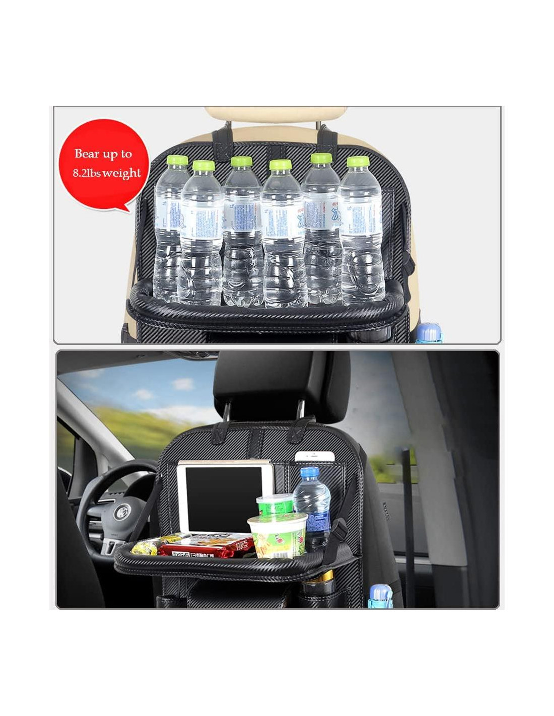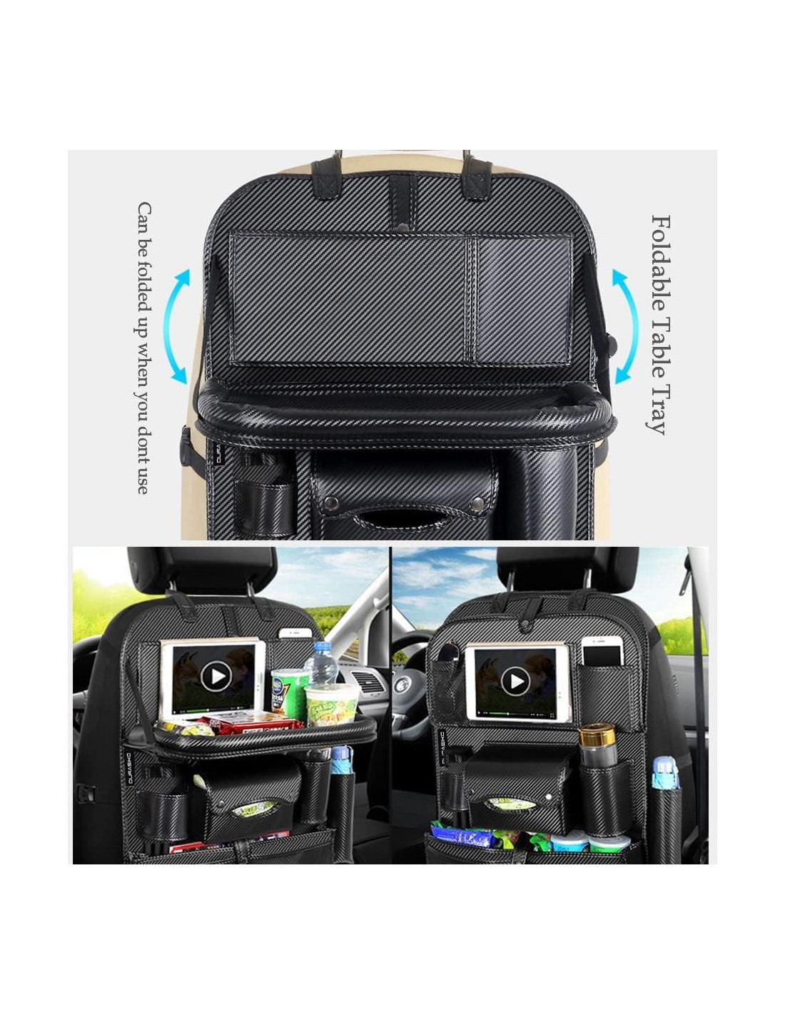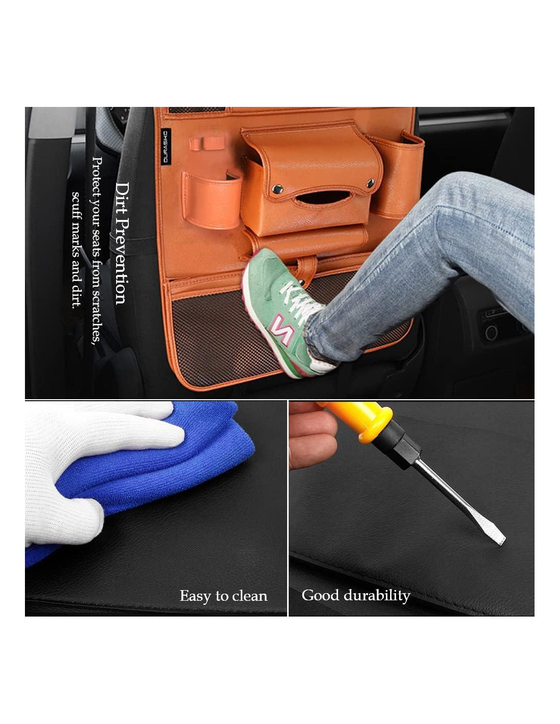 - [Material Premium] Este organizador de asiento trasero de coche está hecho de cuero PU de alta calidad con perfecta propiedad impermeable y buena durabilidad. También puede proteger tus asientos de rasguños, marcas de desgaste y suciedad.