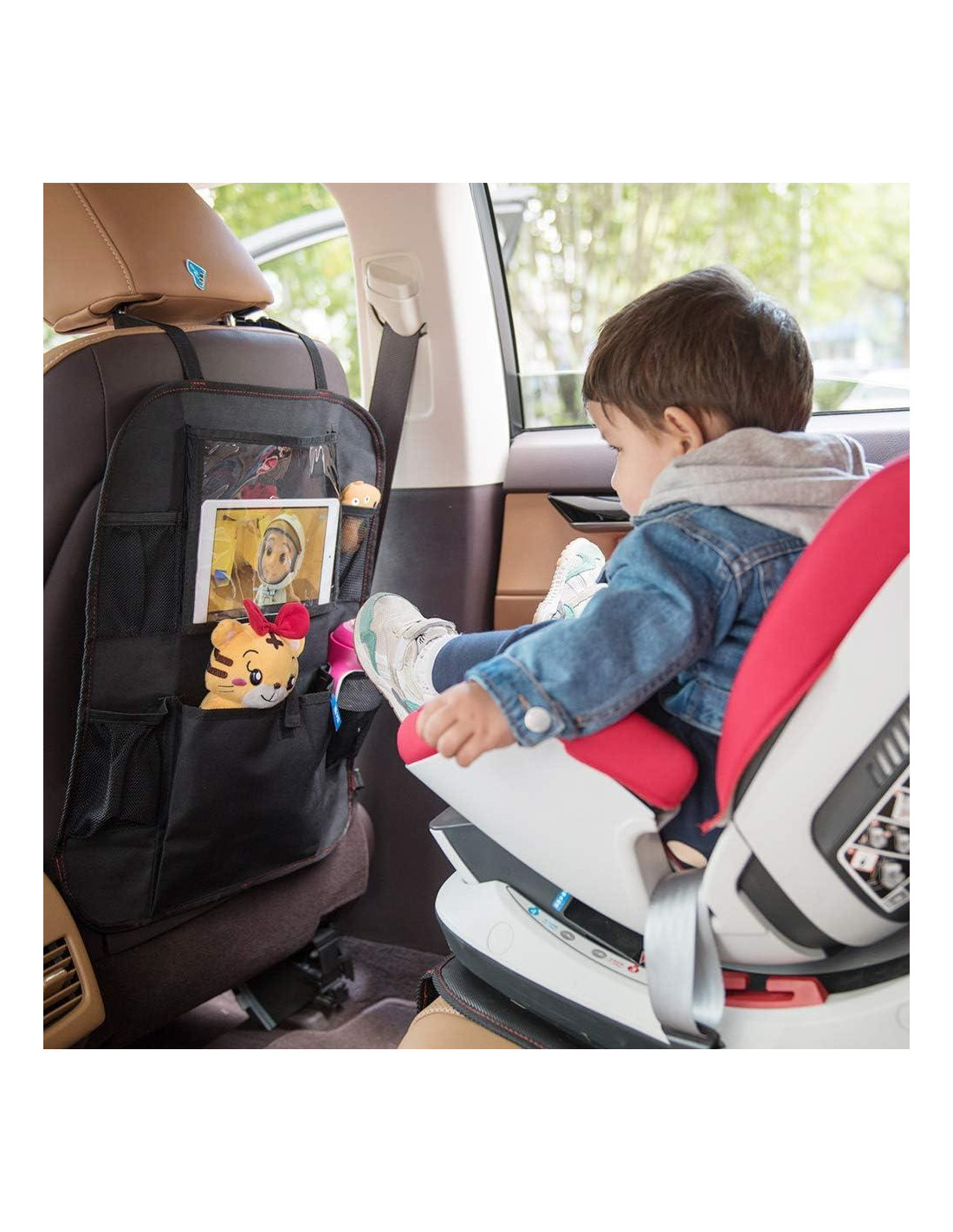 - ENTRETENIMIENTO MANOS LIBRES - Con una ventana de visualización de pantalla táctil clara, el soporte para tabletas del protector de asiento trasero del auto se adapta a la mayoría de los dispositivos iPad y tabletas. Puedes controlar directamente la pantalla de la tableta a través del bolsillo de la ventana, perfecto para que los niños y los pasajeros del asiento trasero disfruten de su entretenimiento.