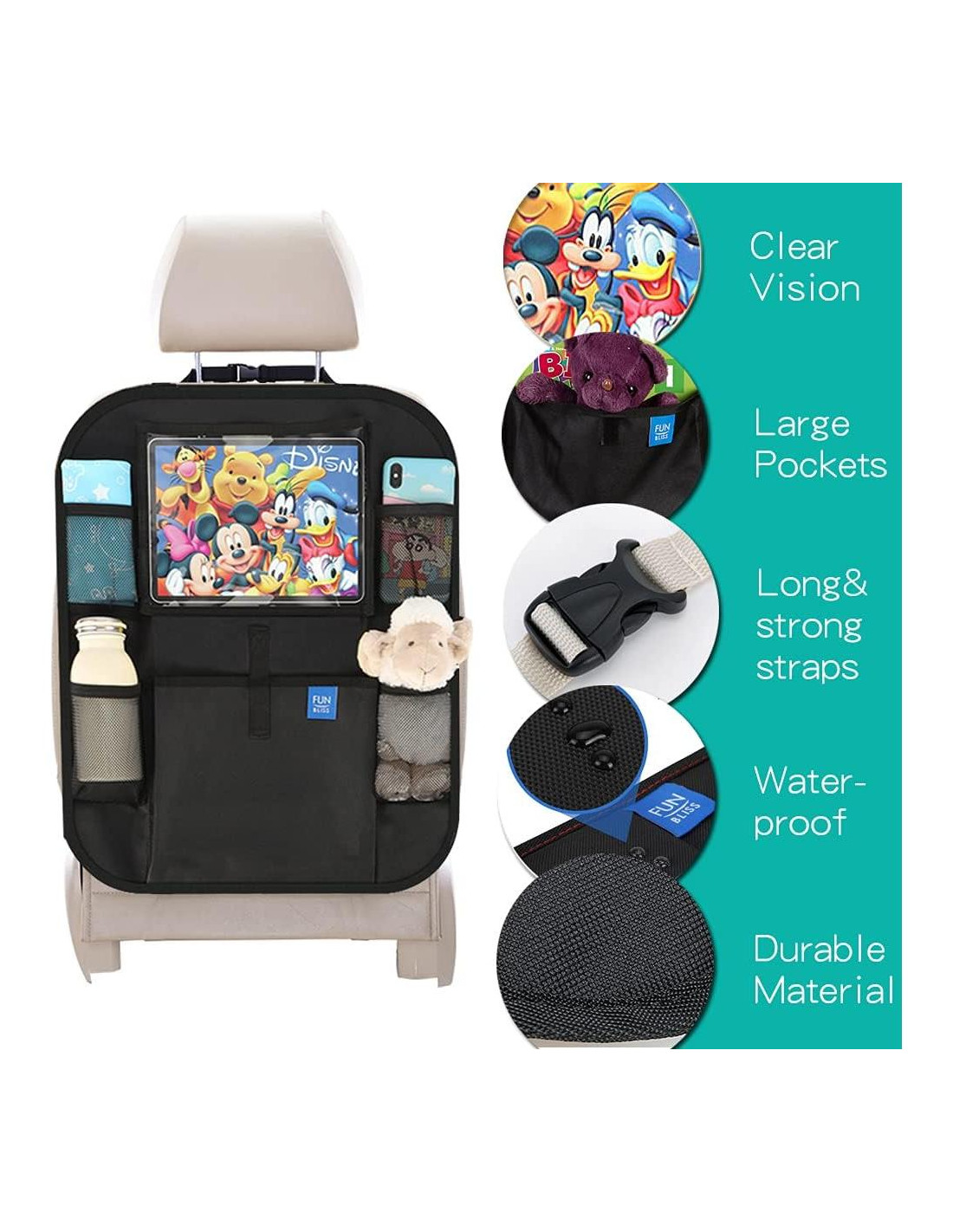 - Almacenamiento de múltiples bolsas - incluye una bolsa de almacenamiento grande y cuatro bolsas de malla para satisfacer tus necesidades multipropósito. Puedes poner tus libros, iPads, juguetes para niños, bocadillos, paraguas, botellas de agua y otros artículos pequeños en este versátil organizador de asiento trasero de coche y almohadilla de patadas para mantener tu coche limpio y ordenado fácilmente.