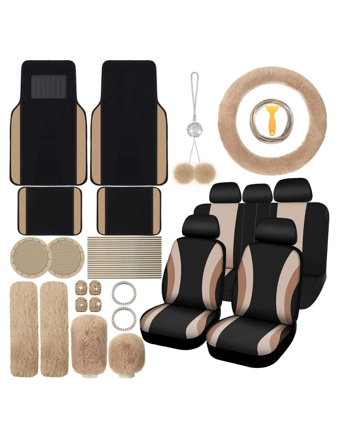 - Juego Completo de Interior de Coche: este kit de accesorios de coche beige con negro incluye 1 juego de fundas para asientos delanteros y traseros, 1 juego de alfombrillas, 2 almohadillas para cinturones de seguridad, 1 funda para volante de coche, 2 alfombrillas para tazas de coche, 1 funda para freno de mano, 1 funda para palanca de cambios, 2 pegatinas circulares, 4 válvulas de coche, 20 líneas de salida de aire, 1 rollo de 5 metros de decoración de moldura interior de coche y 1 raspador, 44 piezas en total