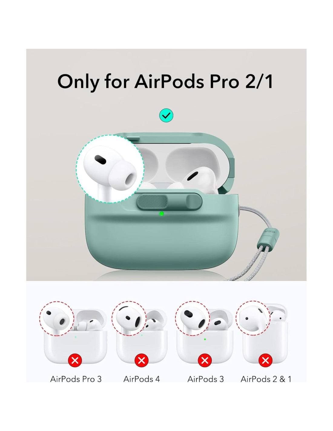 - Compatibilidad: solo compatible con AirPods Pro 2 Generación (2023/2022) (cable USB-C/Lightning) y AirPods Pro 1 Generación (2019); auriculares y funda de carga no incluidos
