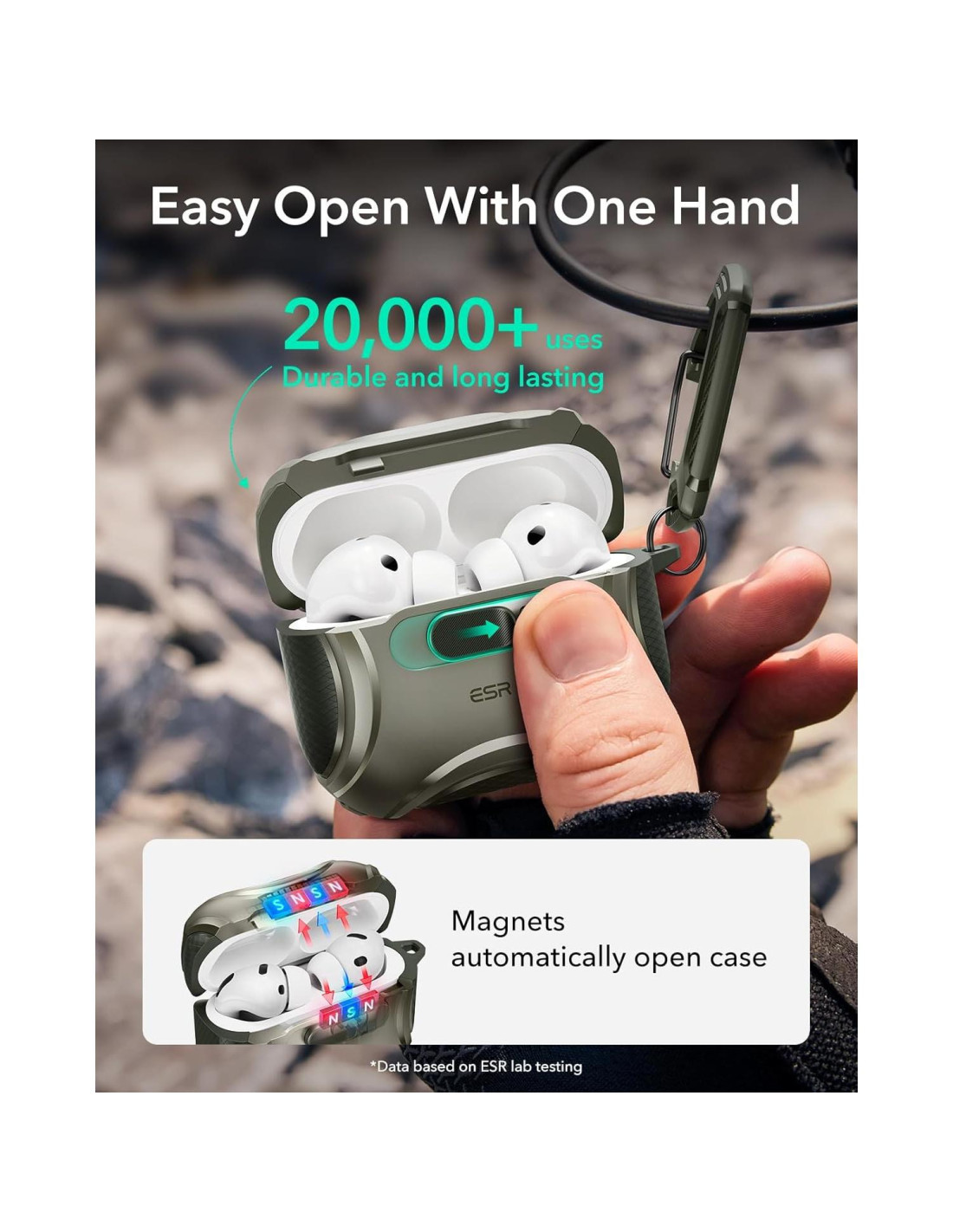 - FlickLock seguro: imanes fuertes con una fuerza de sujeción de 750 g en la parte superior e inferior de la tapa, y un pestillo interno mantienen tus AirPods seguros dentro para que no se salgan si se caen