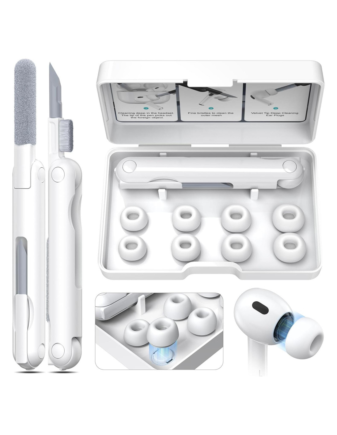 - Bolígrafo de limpieza multifuncional El kit de limpieza tiene una punta de silicona para eliminar la suciedad de grietas y agujeros ocultos. La esponja suave de felpa absorbe el polvo fino dentro del estuche de carga de los auriculares inalámbricos. El cepillo de alta densidad puede limpiar fácilmente la suciedad en el orificio de sonido del auricular.