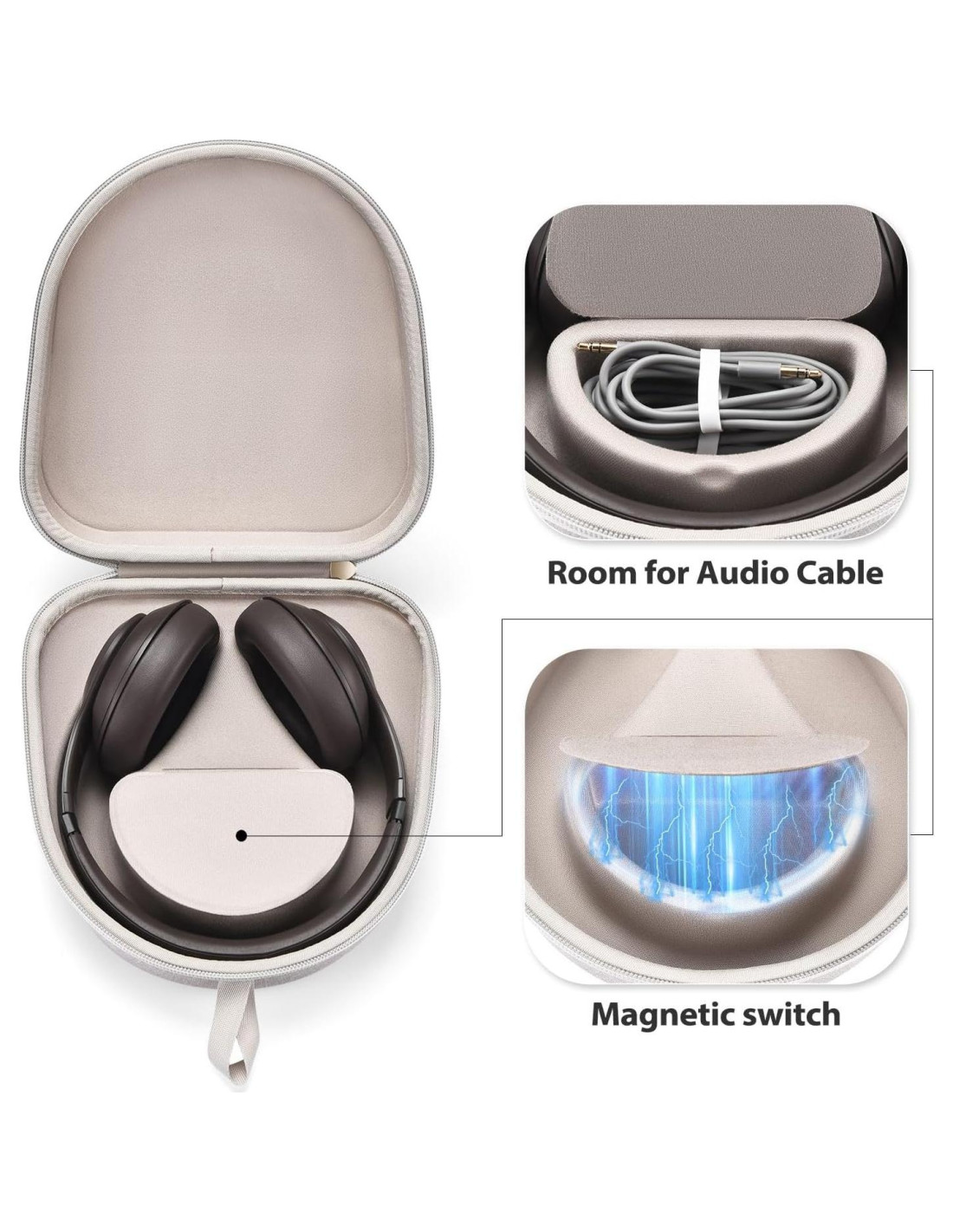 - Ventaja: Diseño interior personalizado para fijar y proteger los auriculares, y hay una caja para cables de datos para almacenar cables de datos, que tiene una función de succión magnética. Correa de mano resistente para portabilidad, cremallera suave pero fuerte de 360 grados para un fácil uso.
