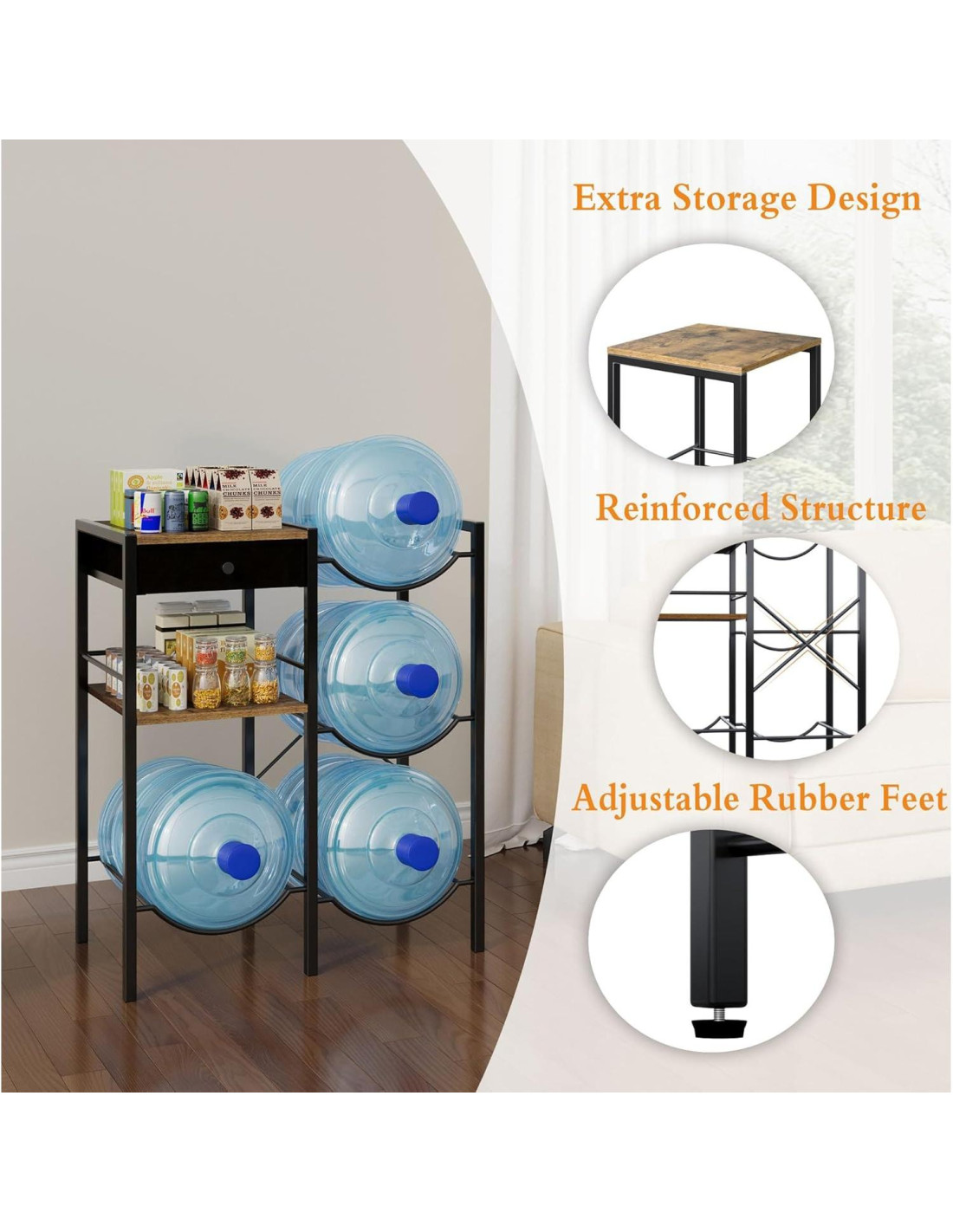 - Gran Capacidad de Almacenamiento: Este soporte para jarras de agua cuenta con 2 mesas de madera premium en la parte superior, que pueden sostener dispensadores de agua pequeños, botellas de agua, jarras de agua, tazas de café, plantas en macetas, etc. El cajón satisface las necesidades de almacenamiento de té, café, tapa de jarras de agua de 5 galones y varios artículos pequeños sin preocuparse por caerse al suelo.