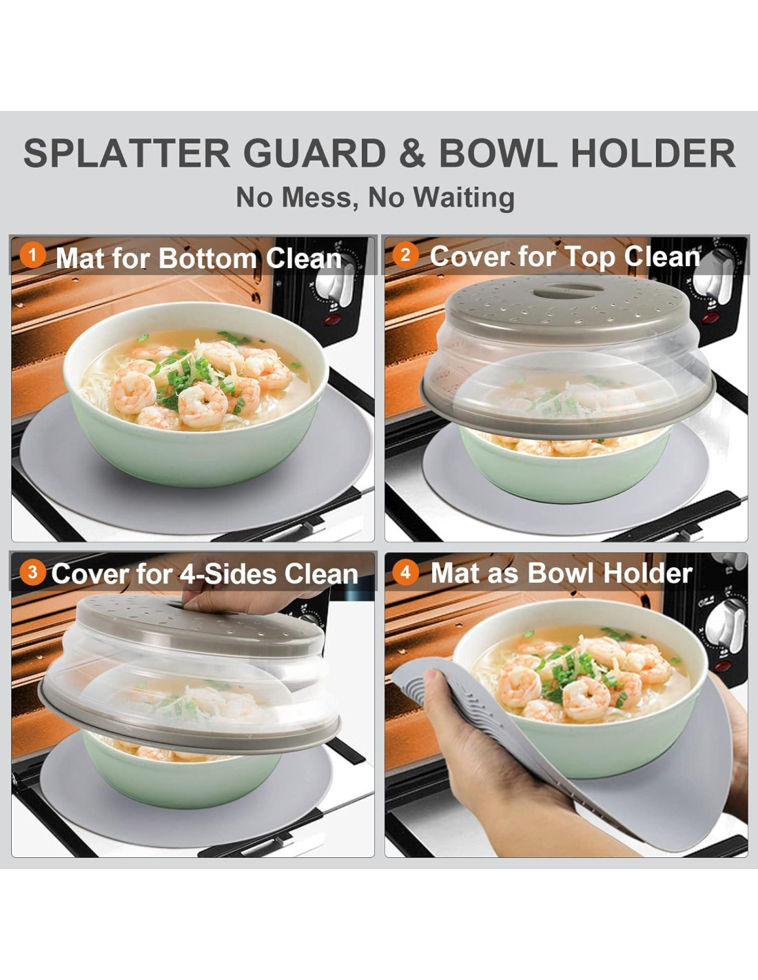 - [Combina Perfectamente] Cubierta de Microondas para Alimentos y Tapete Multiusos de 10" (25.4 cm) - Tapete como Soporte para Tazones, Cubierta como Protección contra Salpicaduras. No solo mantiene tu microondas limpio sino que también previene quemaduras. El Tapete de Microondas te permite sacar la comida inmediatamente después de calentar. Sin esperar, sin quemaduras.