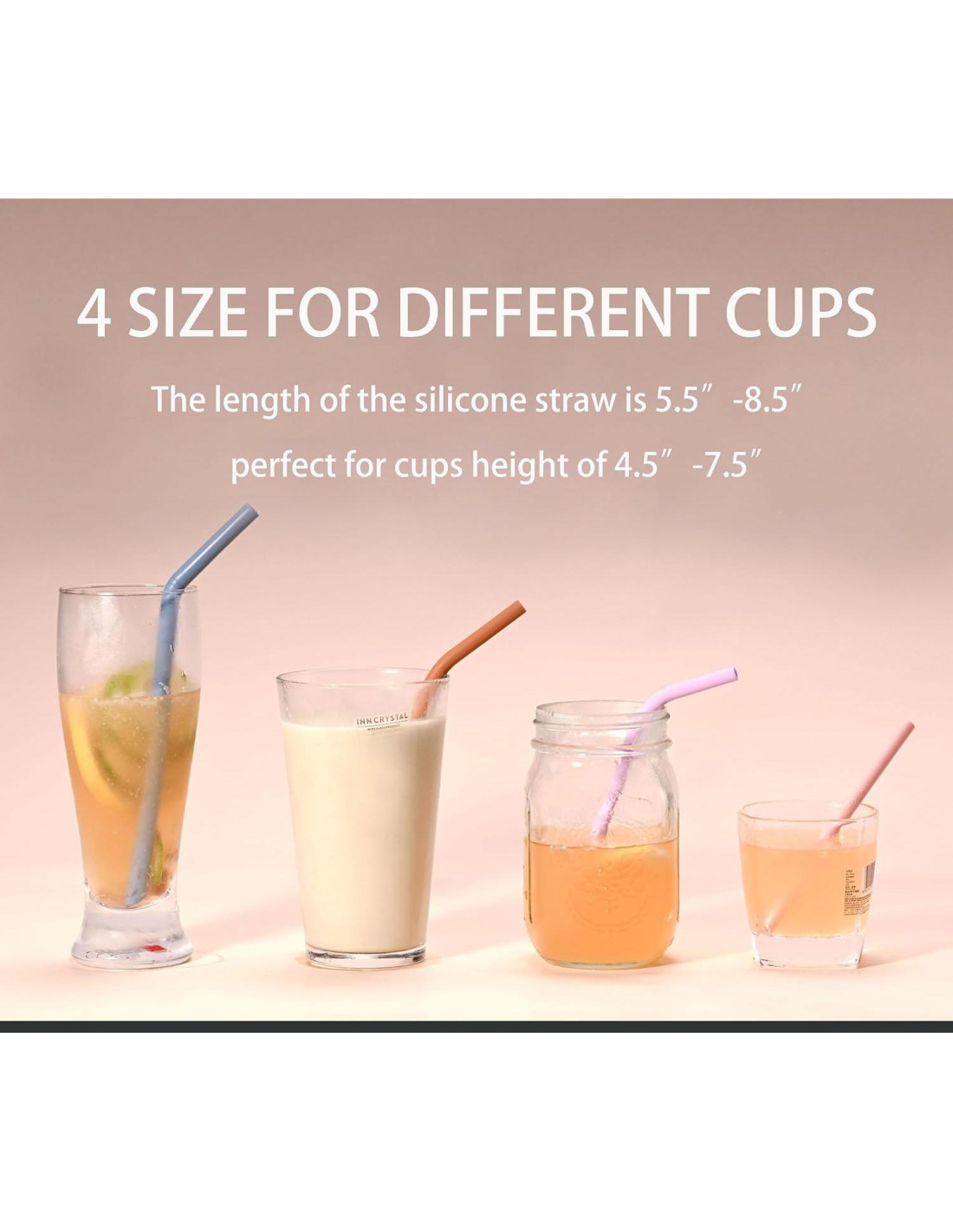 - Juego Familiar para Niños y Adultos para Bebidas Regulares y Espesas: Nuestros popotes de silicona van de 5.5" (14 cm) a 8.5" (21.6 cm) de longitud para vasos de 4-20 oz (118-591 ml) de altura 4.5" (11.4 cm) a 7.5" (19.1 cm), 3 tamaños (5.5" (14 cm) recto, 6.7" (17 cm) doblado, 8" (20.3 cm) doblado) son de diámetro estándar para líquidos regulares, un tamaño (8.5" (21.6 cm) doblado) es de diámetro ancho para batidos espesos. El popote de 5.5" (14 cm) está hecho a medida para vasos de niños.