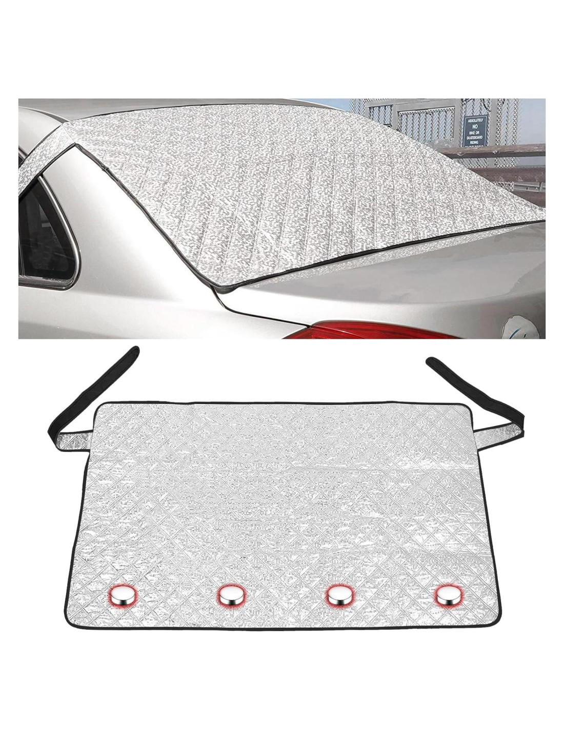 - Fácil de Usar: Coloca la cubierta plana sobre el parabrisas, sujeta las solapas largas en las puertas del asiento trasero. El imán se ajustará automáticamente al parabrisas trasero para completar la instalación. Cuando se ensucie, simplemente límpialo sin dejar residuos. Se puede almacenar fácilmente simplemente plegándolo cuando no esté en uso.