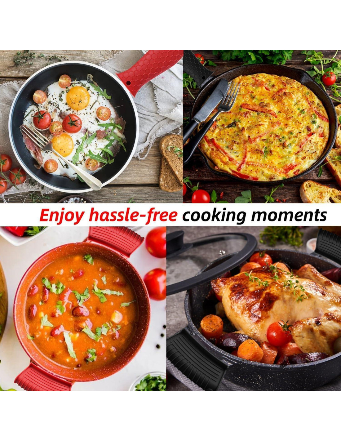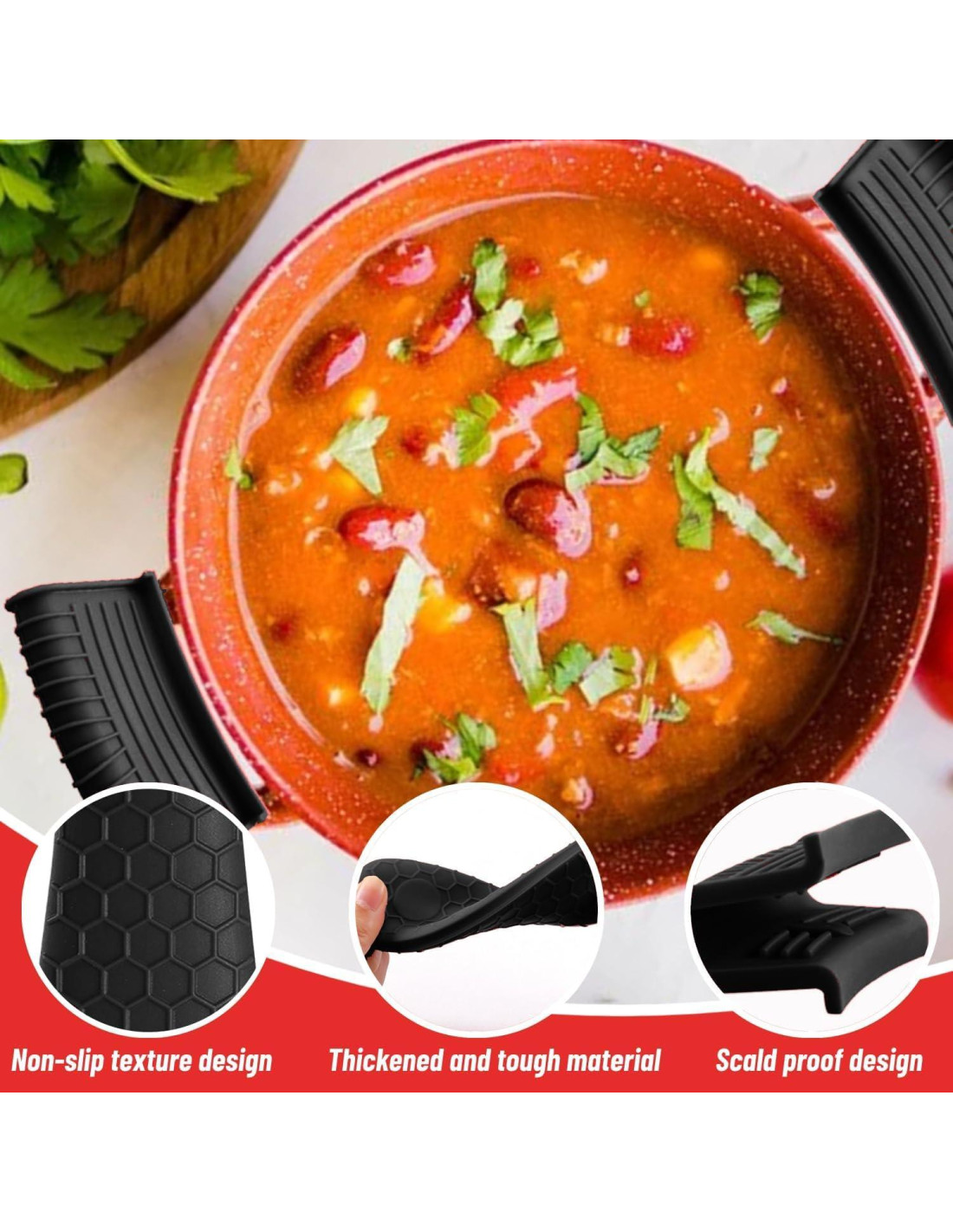 - Diseño antideslizante: La funda para el mango de la olla está diseñada para ajustarse perfectamente a su sartén de hierro fundido. La textura antideslizante y las costillas de silicona dentro de la funda aseguran un agarre seguro al mover utensilios de cocina calientes, previniendo eficazmente deslizamientos.
