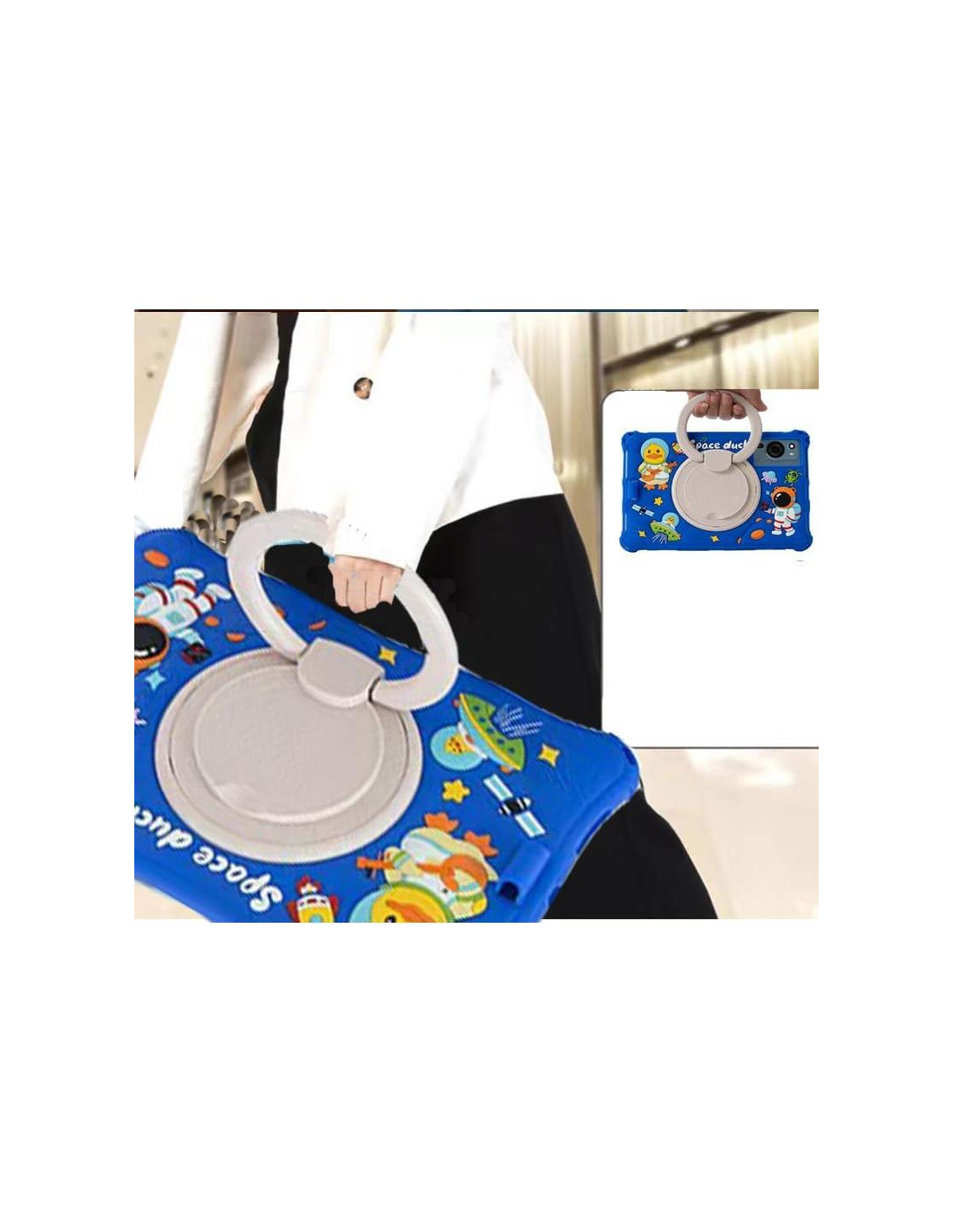 - [Práctica] Tiene funciones anti-huellas y anti-caídas, amortiguando efectivamente el impacto de la caída de la tablet y los bordes elevados protegen perfectamente la cámara. Diseño de contraste de colores a la moda, bordes suaves, recortes precisos permiten el acceso completo a todos los puertos, botones y características. El soporte giratorio de 360 grados permite ver sin manos. Soporte giratorio de 360 grados conveniente para llevar la tablet. Equipado con una correa ajustable y un lápiz para llevar su tablet fácilmente.