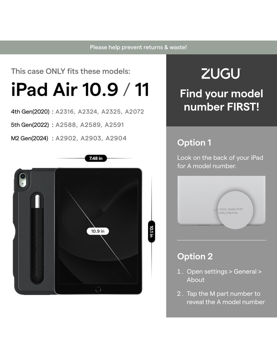 - Modelos Compatibles - iPad Air (M3) 11 pulgadas 2025, (M2) 11 pulgadas (2024) iPad Air 4ta y 5ta Generación 10.9 pulgadas 2020 / 2022 (Parte trasera del modelo de iPad #'s A2902, A2903, A2904, A2588, A2589, A2591, A2316, A2324, A2325, y A2072) Soporta carga inalámbrica de Apple Pencil 2 / Pro (Lápiz No Incluido) con bolsillo de almacenamiento en la parte trasera.