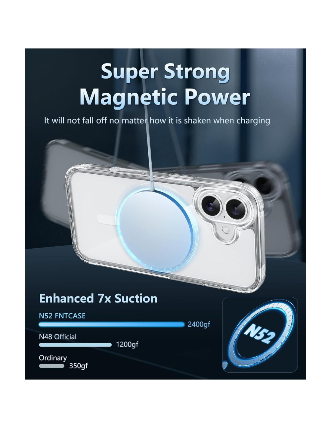 - Fuerte Atracción Magnética: Se alinea perfectamente con bancos de energía inalámbricos, billeteras, soportes para automóviles y bases de carga inalámbrica. La funda magnética para iPhone 16 tiene 38 imanes N52 superpotentes incorporados. Su atracción magnética alcanza 2400 gf, lo que es casi 7 veces más fuerte que lo ordinario, por lo tanto, no se caerá sin importar cuánto se agite mientras se carga