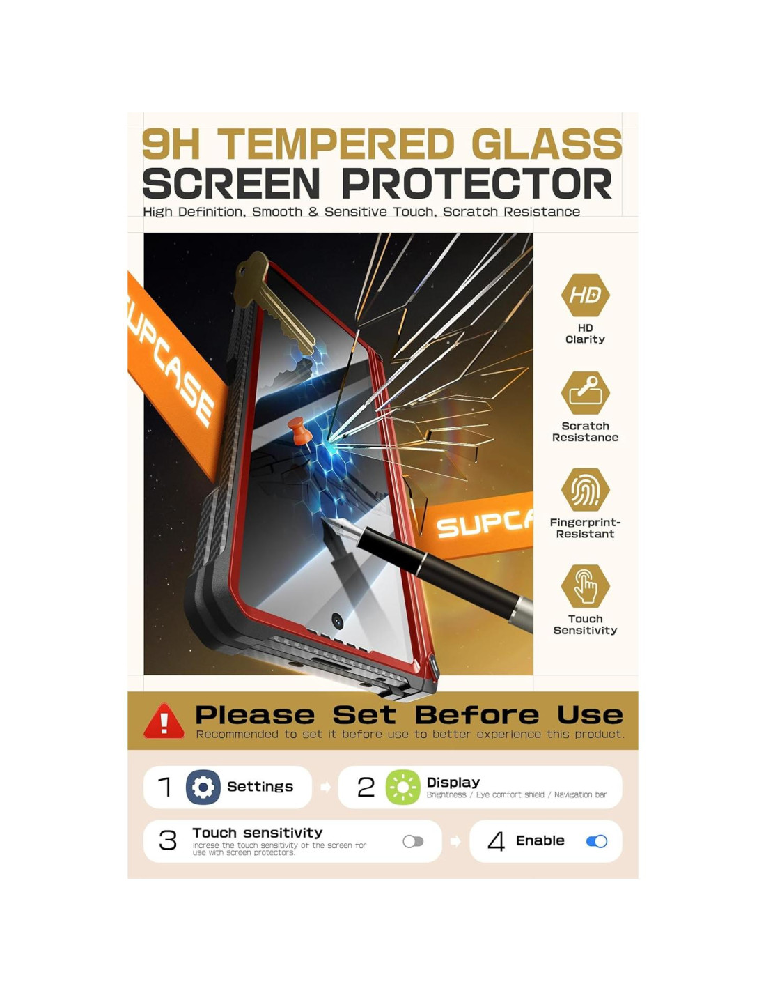 - [Protector de Pantalla HD Integrado] La Funda de Teléfono Galaxy Z Fold 6 de alta resistencia tiene una película protectora de vidrio templado 9H de alta sensibilidad táctil que es resistente a impactos y al desgaste, puede proteger la pantalla frontal de rasguños y grietas sin comprometer su sensibilidad de respuesta táctil original. Consejo: Para el mejor rendimiento táctil de la pantalla, sigue la guía a continuación para optimizar la configuración de sensibilidad de la pantalla. Incluyendo Paso 1: Abrir "Configuraciones", Paso 2: Pantalla (Brillo/Protección Ocular/Barra de Navegación), Paso 3: Sensibilidad Táctil (Aumentar la sensibilidad de la pantalla para usar con el protector de pantalla), Paso 4: Habilitar.