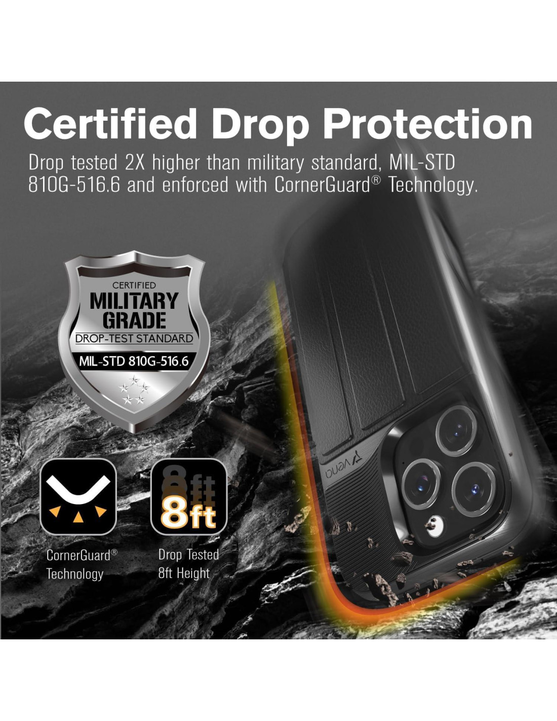 Con la funda de cartera vCommute patentada de Vena, almacena cómodamente hasta 3 tarjetas como tu identificación o tarjetas de crédito/débito, en el compartimento oculto para tarjetas en la parte posterior de la funda. Mejor aún, vCommute incluso funciona con Apple Pay. Compatible con iPhone 16 Pro (16 cm). Esta funda única y versátil para tarjetas cuenta con una resistente cubierta de cuero que se pliega para convertirse en un soporte, brindándote la comodidad de ver videos y películas en el ángulo que desees. La funda para tarjetas de crédito vCommute está diseñada con cortes de precisión y proporciona acceso sin esfuerzo a todos los puertos, botones y funciones de tu teléfono. Los botones de encendido y volumen están diseñados para mantener la misma gran retroalimentación táctil que los botones de tu teléfono. Hecha de policarbonato (PC) de primera calidad y poliuretano termoplástico (TPU) que absorbe impactos, esta funda con soporte para tarjetas de crédito ha sido probada para superar el estándar MIL-STD 810G-516.6, sobreviviendo a 26 caídas desde 2.4 metros de altura. Con tecnología CornerGuard. La resistente solapa de cuero es compatible con soportes magnéticos para teléfonos en automóviles, sin necesidad de placa adicional o adhesivo. vCommute vCommuteX vArmor vCommute - Texto Personalizado